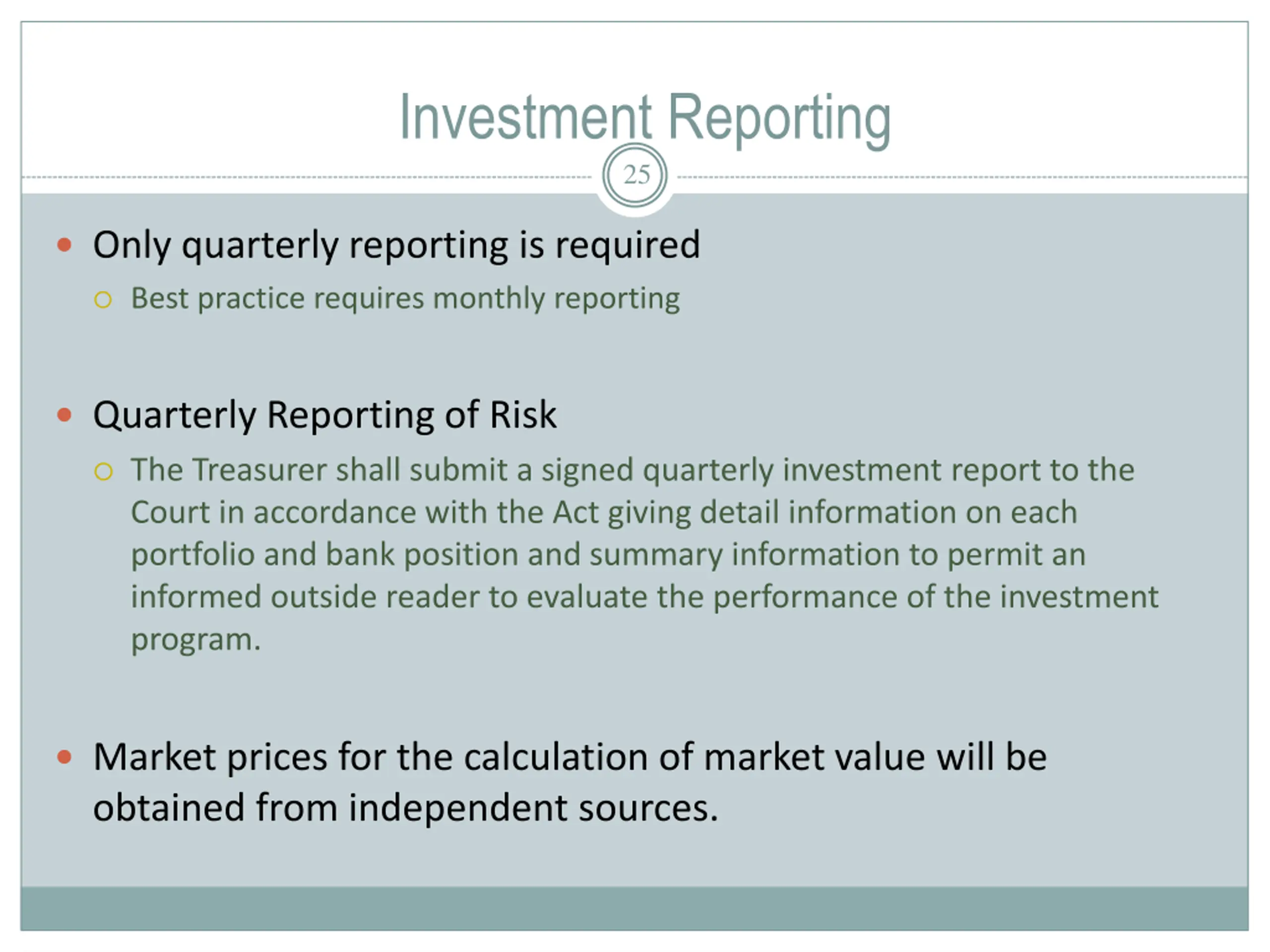 Investment Reporting 25 Only quarterly reporting is required Best practice requires monthly reporting Quarterly Reporting of Risk The Treasurer shall submit a signed quarterly investment report to the Court in accordance with the Act giving detail information on each portfolio and bank position and summary information to permit an informed outside reader to evaluate the performance of the investment program. Market prices for the calculation of market value will be obtained from independent sources.