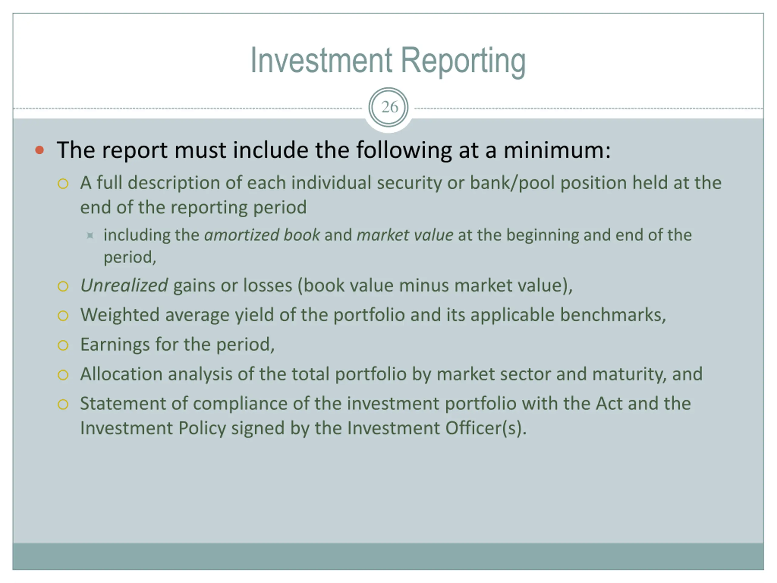 Investment Reporting 26 The report must include the following at a minimum: A full description of each individual security or bank/pool position held at the end of the reporting period including the amortized book and market value at the beginning and end of the period, Unrealized gains or losses (book value minus market value), Weighted average yield of the portfolio and its applicable benchmarks, Earnings for the period, Allocation analysis of the total portfolio by market sector and maturity, and Statement of compliance of the investment portfolio with the Act and the Investment Policy signed by the Investment Officer(s).
