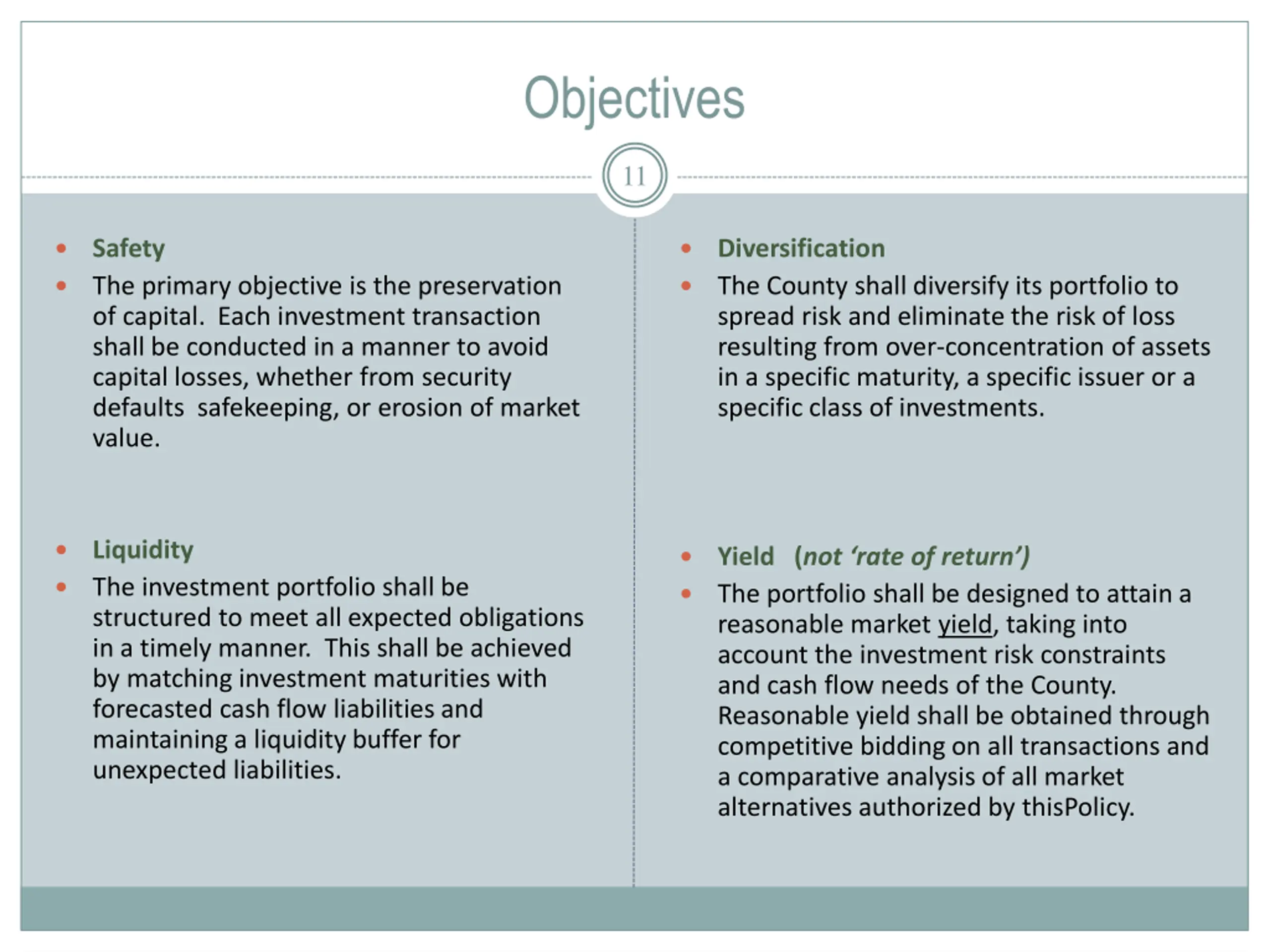 Objectives 11 Safety The primary objective is the preservation of capital. Each investment transaction shall be conducted in a manner to avoid capital losses, whether from security defaults safekeeping, or erosion of market value. Diversification The County shall diversify its portfolio to spread risk and eliminate the risk of loss resulting from over-concentration of assets in a specific maturity, a specific issuer or a specific class of investments. Liquidity The investment portfolio shall be structured to meet all expected obligations in a timely manner. This shall be achieved by matching investment maturities with forecasted cash flow liabilities and maintaining a liquidity buffer for unexpected liabilities. Yield (not rate of return ) The portfolio shall be designed to attain a reasonable market yield, taking into account the investment risk constraints and cash flow needs of the County. Reasonable yield shall be obtained through competitive bidding on all transactions and a comparative analysis of all market alternatives authorized by thisPolicy.