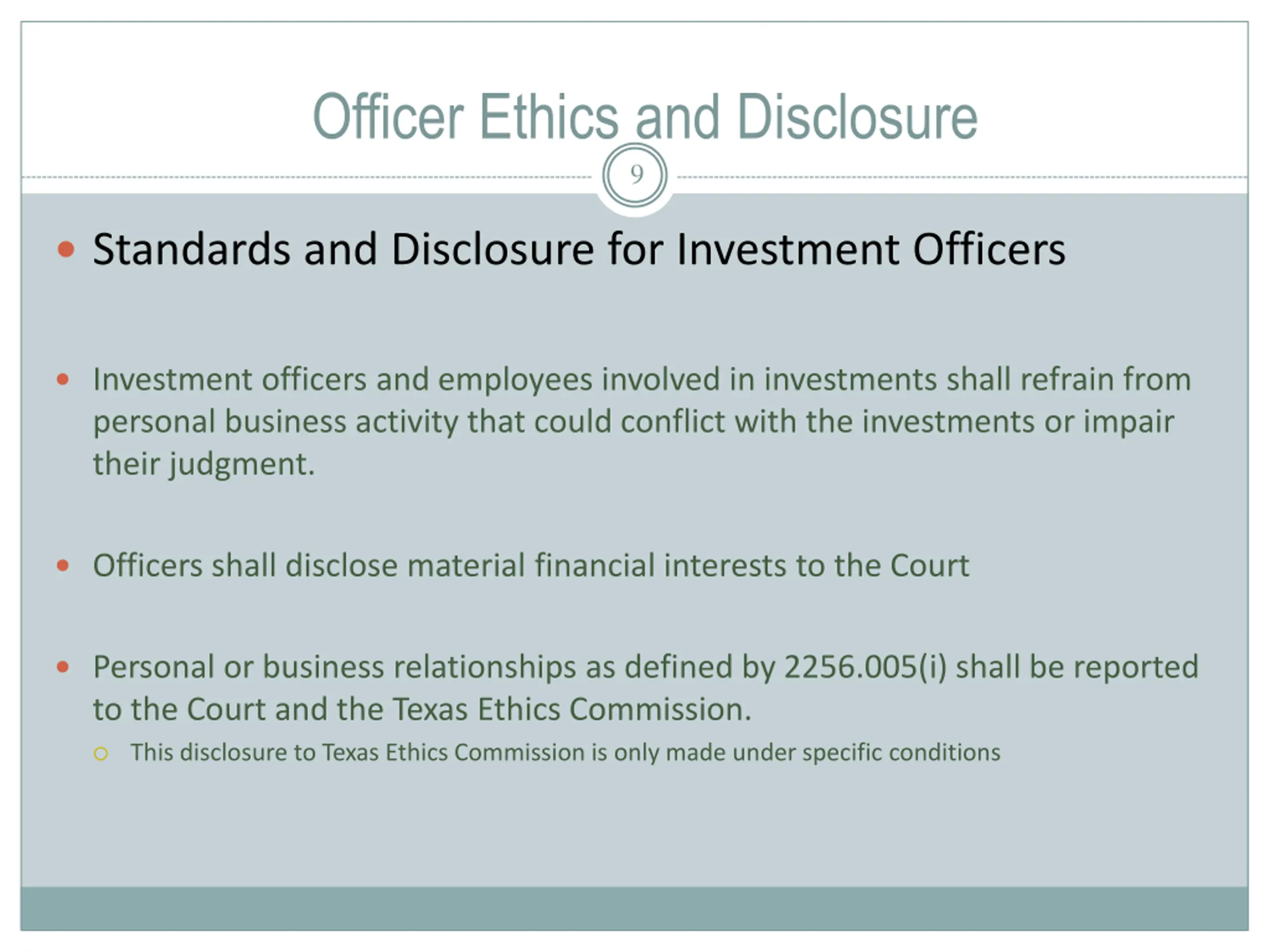 Officer Ethics and Disclosure 9 Standards and Disclosure for Investment Officers Investment officers and employees involved in investments shall refrain from personal business activity that could conflict with the investments or impair their judgment. Officers shall disclose material financial interests to the Court Personal or business relationships as defined by 2256.005(i) shall be reported to the Court and the Texas Ethics Commission. This disclosure to Texas Ethics Commission is only made under specific conditions