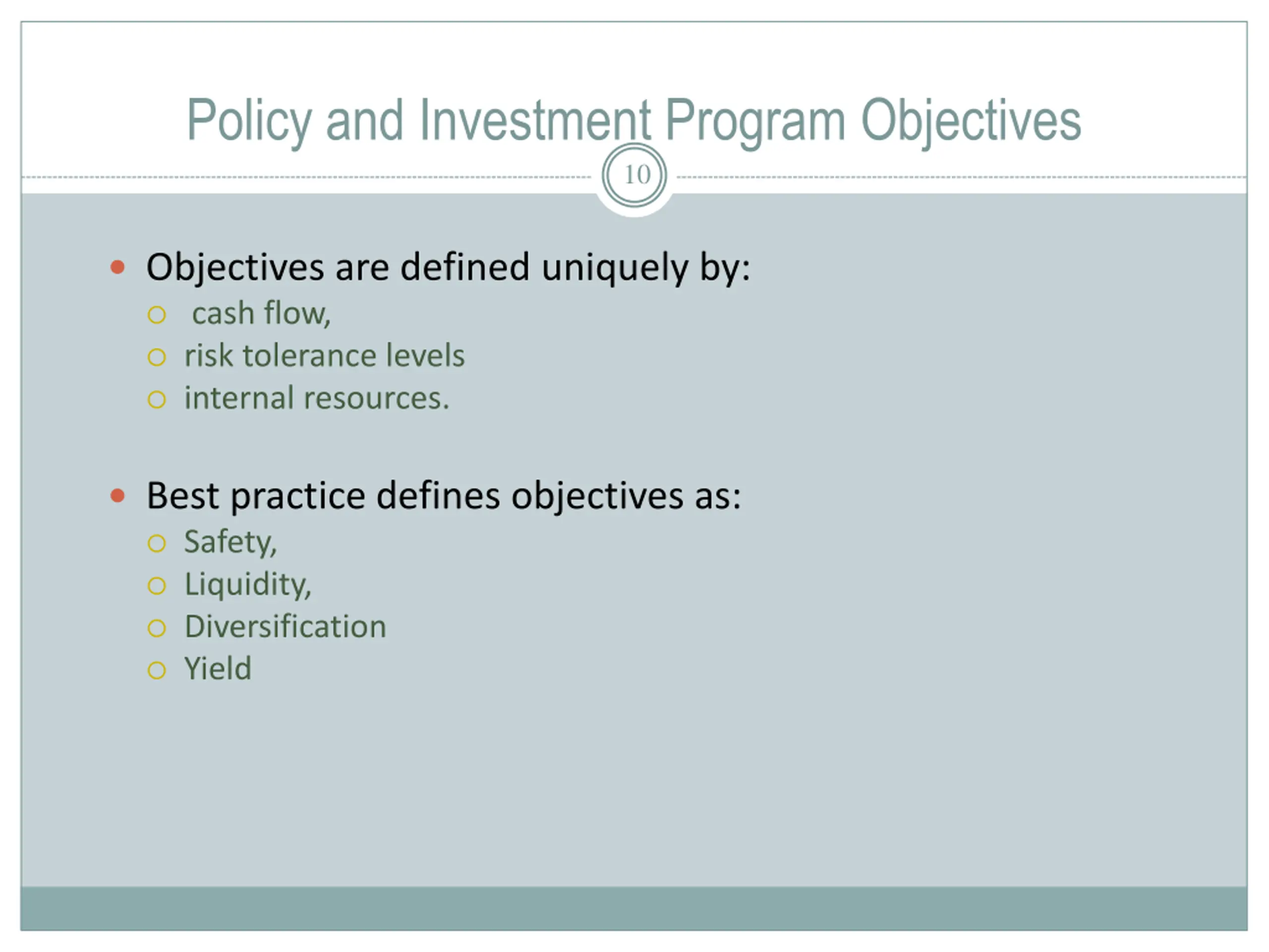 Policy and Investment Program Objectives 10 Objectives are defined uniquely by: cash flow, risk tolerance levels internal resources. Best practice defines objectives as: Safety, Liquidity, Diversification Yield