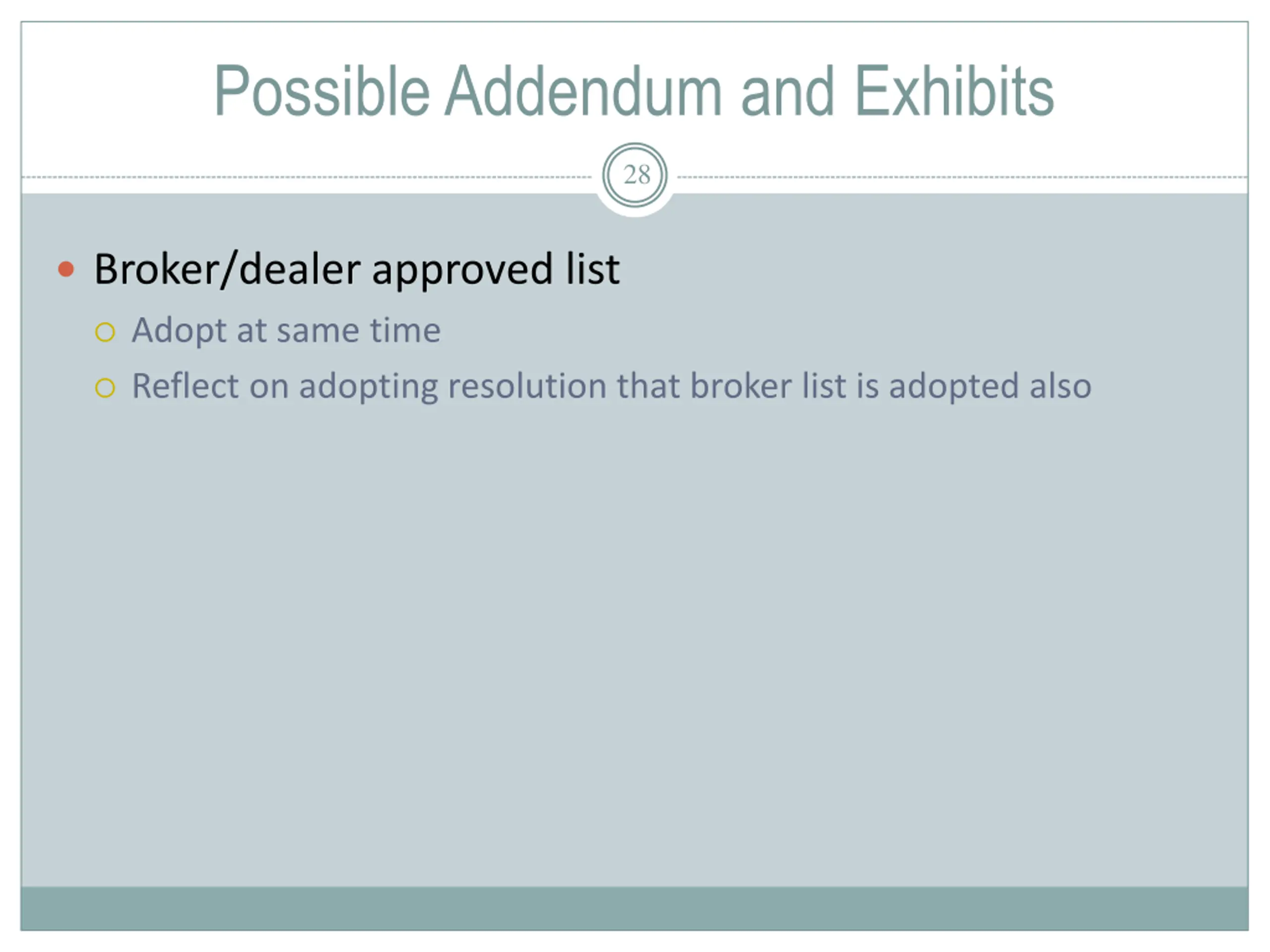 Possible Addendum and Exhibits 28 Broker/dealer approved list Adopt at same time Reflect on adopting resolution that broker list is adopted also