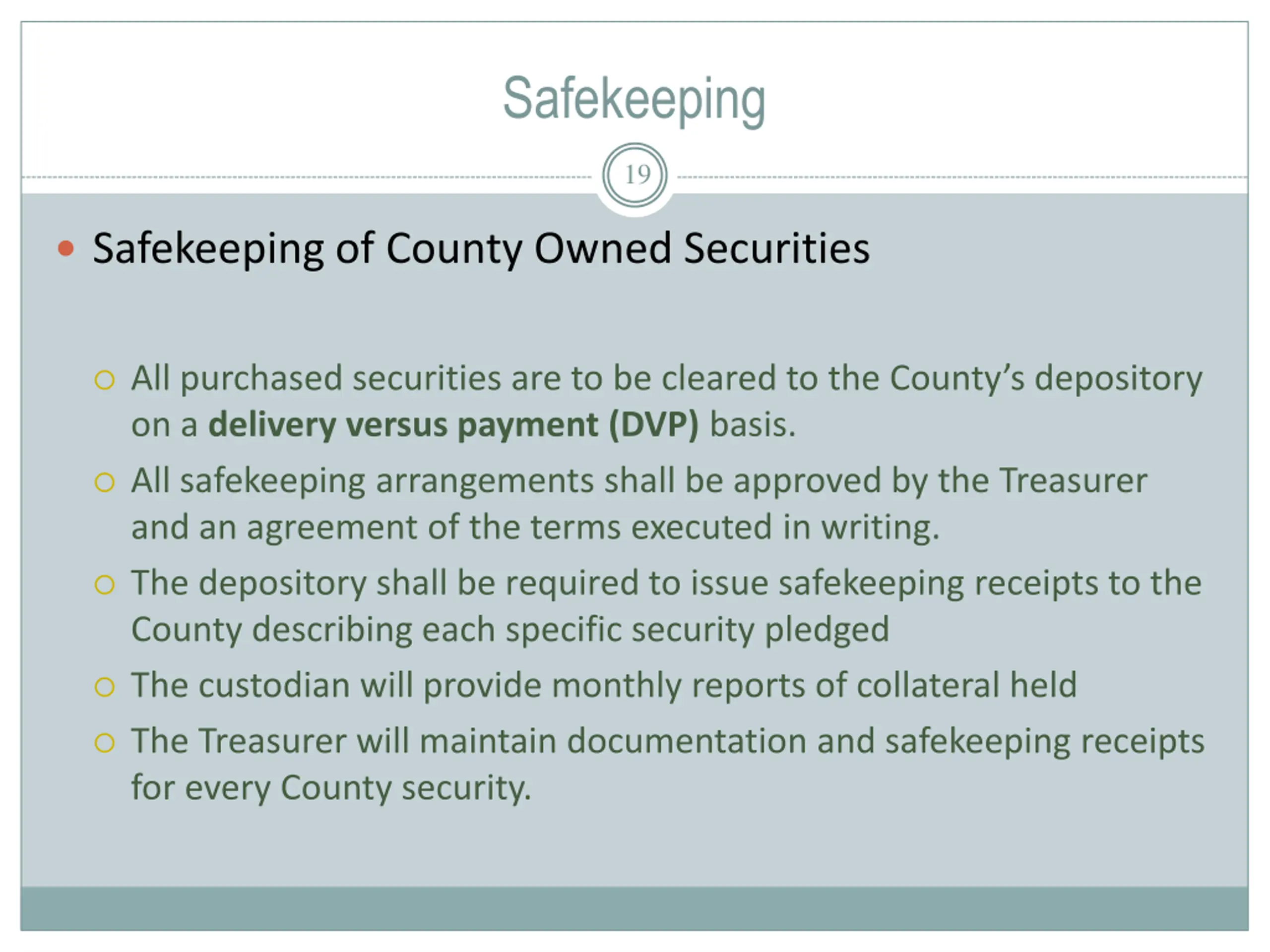 Safekeeping 19 Safekeeping of County Owned Securities All purchased securities are to be cleared to the County s depository on a delivery versus payment (DVP) basis. All safekeeping arrangements shall be approved by the Treasurer and an agreement of the terms executed in writing. The depository shall be required to issue safekeeping receipts to the County describing each specific security pledged The custodian will provide monthly reports of collateral held The Treasurer will maintain documentation and safekeeping receipts for every County security.