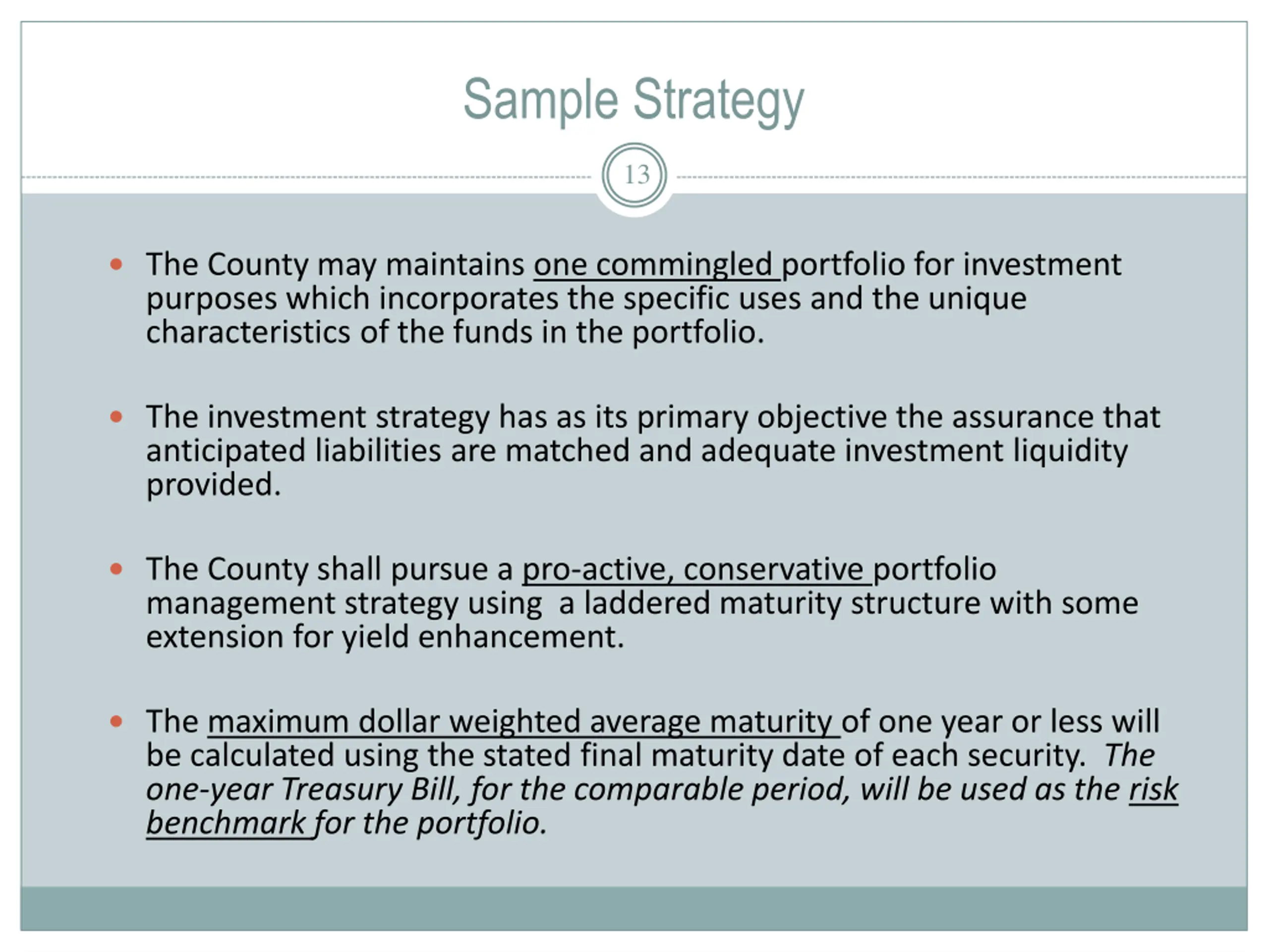 Sample Strategy 13 The County may maintains one commingled portfolio for investment purposes which incorporates the specific uses and the unique characteristics of the funds in the portfolio. The investment strategy has as its primary objective the assurance that anticipated liabilities are matched and adequate investment liquidity provided. The County shall pursue a pro-active, conservative portfolio management strategy using a laddered maturity structure with some extension for yield enhancement. The maximum dollar weighted average maturity of one year or less will be calculated using the stated final maturity date of each security. The one-year Treasury Bill, for the comparable period, will be used as the risk benchmark for the portfolio.