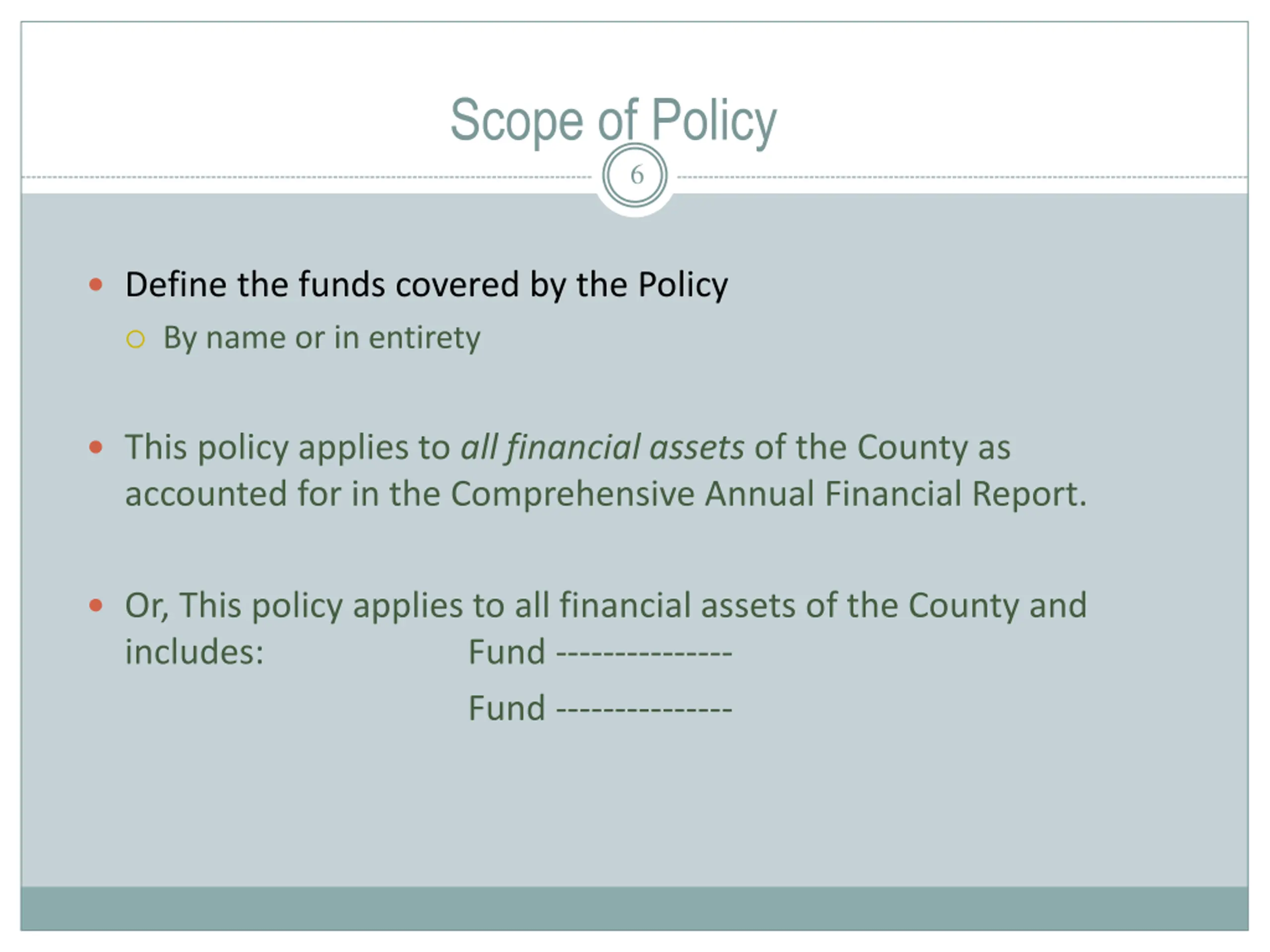 Scope of Policy 6 Define the funds covered by the Policy By name or in entirety This policy applies to all financial assets of the County as accounted for in the Comprehensive Annual Financial Report. Or, This policy applies to all financial assets of the County and includes: Fund --------------- Fund ---------------