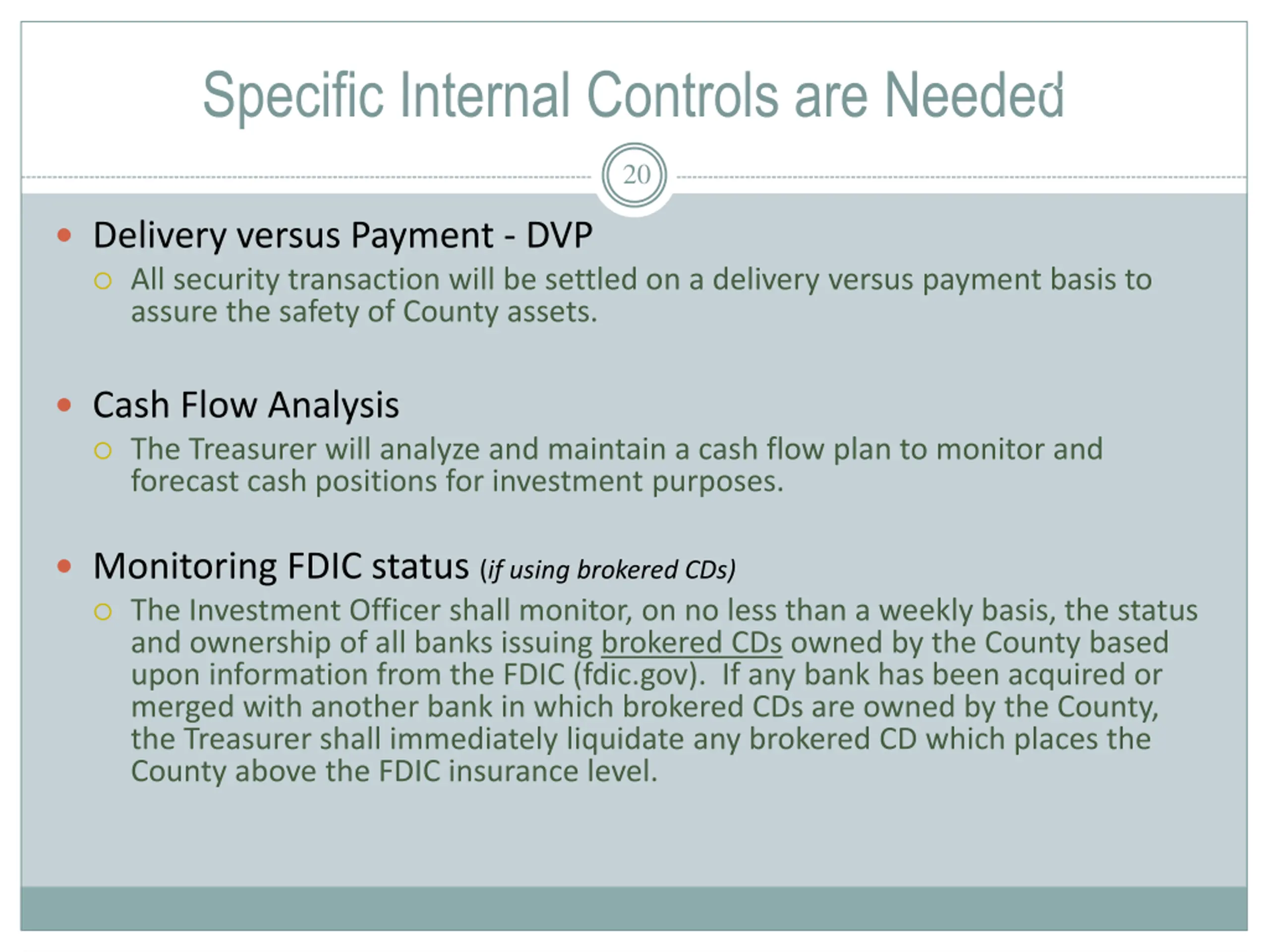 CASH Specific Internal Controls are Needed 20 Delivery versus Payment - DVP All security transaction will be settled on a delivery versus payment basis to assure the safety of County assets. Cash Flow Analysis The Treasurer will analyze and maintain a cash flow plan to monitor and forecast cash positions for investment purposes. Monitoring FDIC status (if using brokered CDs) The Investment Officer shall monitor, on no less than a weekly basis, the status and ownership of all banks issuing brokered CDs owned by the County based upon information from the FDIC (fdic.gov). If any bank has been acquired or merged with another bank in which brokered CDs are owned by the County, the Treasurer shall immediately liquidate any brokered CD which places the County above the FDIC insurance level.
