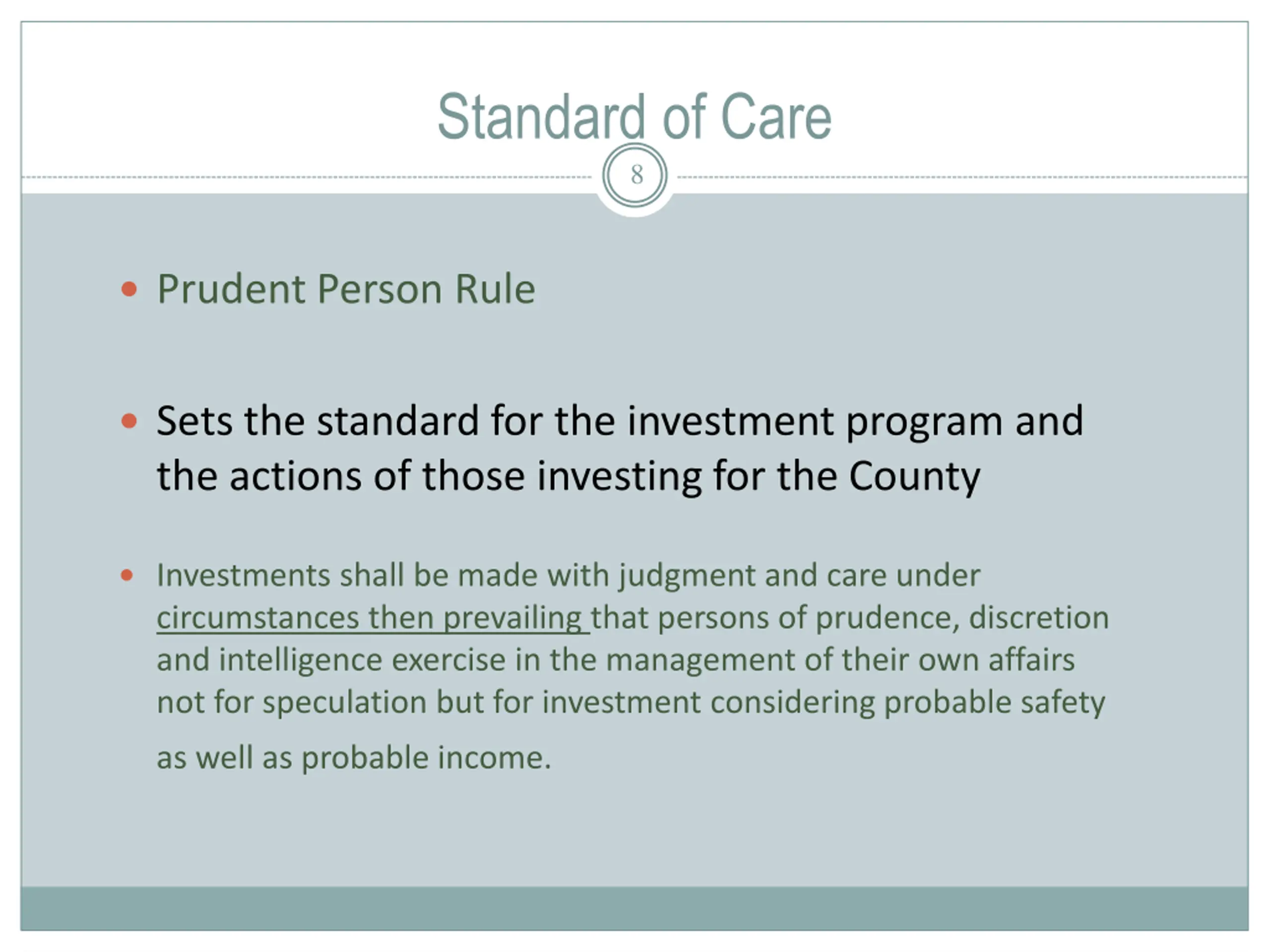 Standard of Care 8 Prudent Person Rule Sets the standard for the investment program and the actions of those investing for the County Investments shall be made with judgment and care under circumstances then prevailing that persons of prudence, discretion and intelligence exercise in the management of their own affairs not for speculation but for investment considering probable safety as well as probable income.