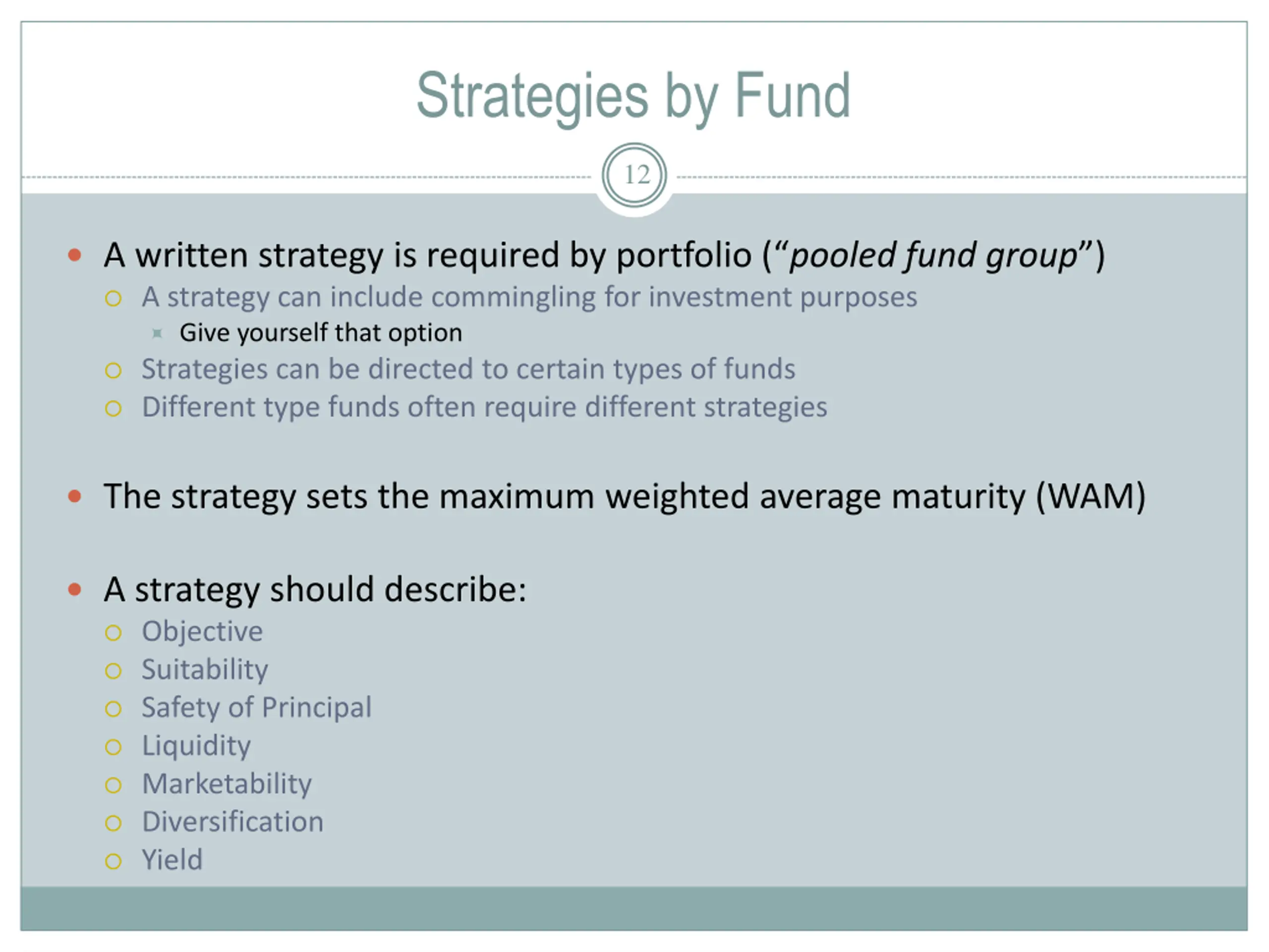 Strategies by Fund 12 A written strategy is required by portfolio ( pooled fund group ) A strategy can include commingling for investment purposes Give yourself that option Strategies can be directed to certain types of funds Different type funds often require different strategies The strategy sets the maximum weighted average maturity (WAM) A strategy should describe: Objective Suitability Safety of Principal Liquidity Marketability Diversification Yield