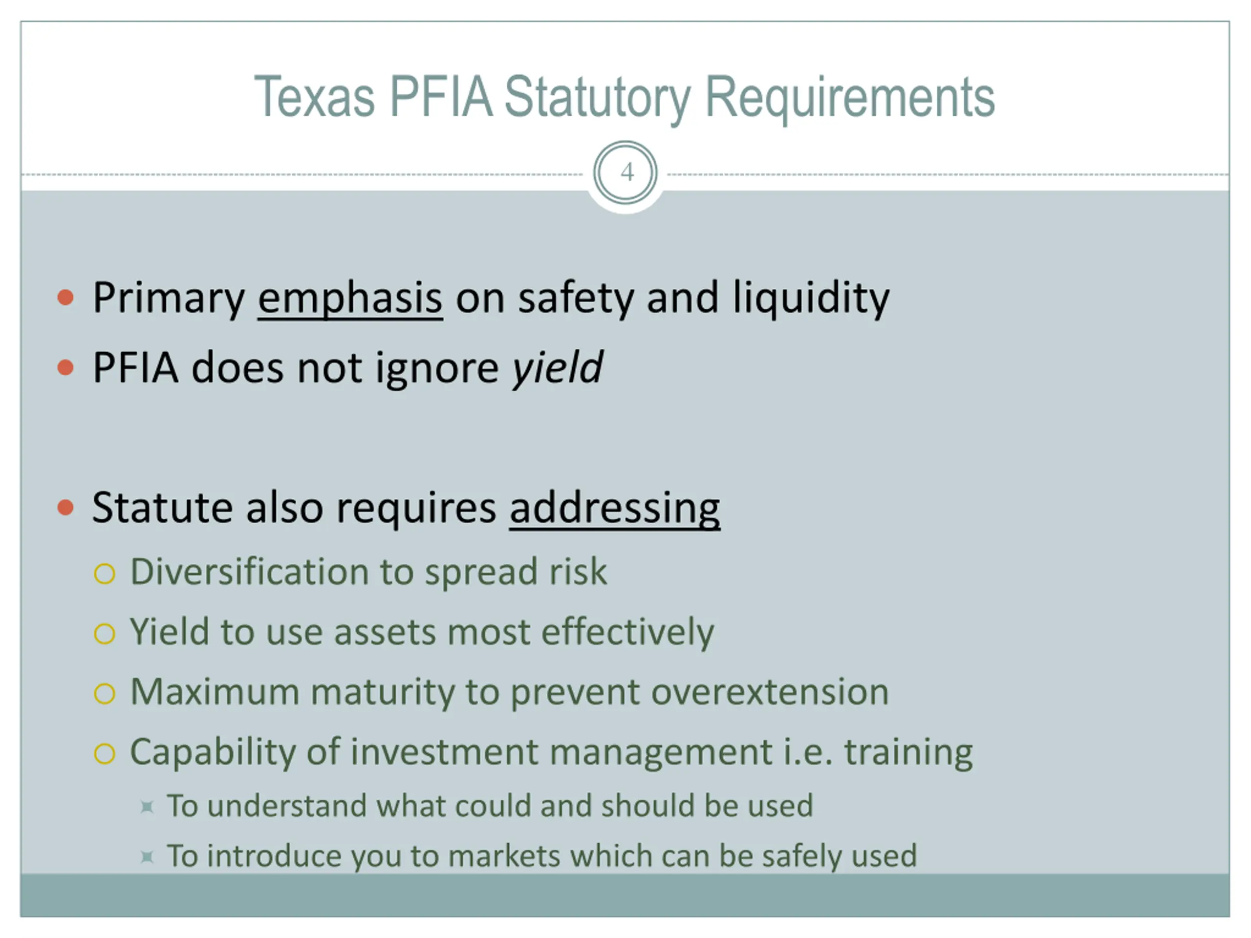 Texas PFIA Statutory Requirements 4 Primary emphasis on safety and liquidity PFIA does not ignore yield Statute also requires addressing Diversification to spread risk Yield to use assets most effectively Maximum maturity to prevent overextension Capability of investment management i.e. training To understand what could and should be used To introduce you to markets which can be safely used