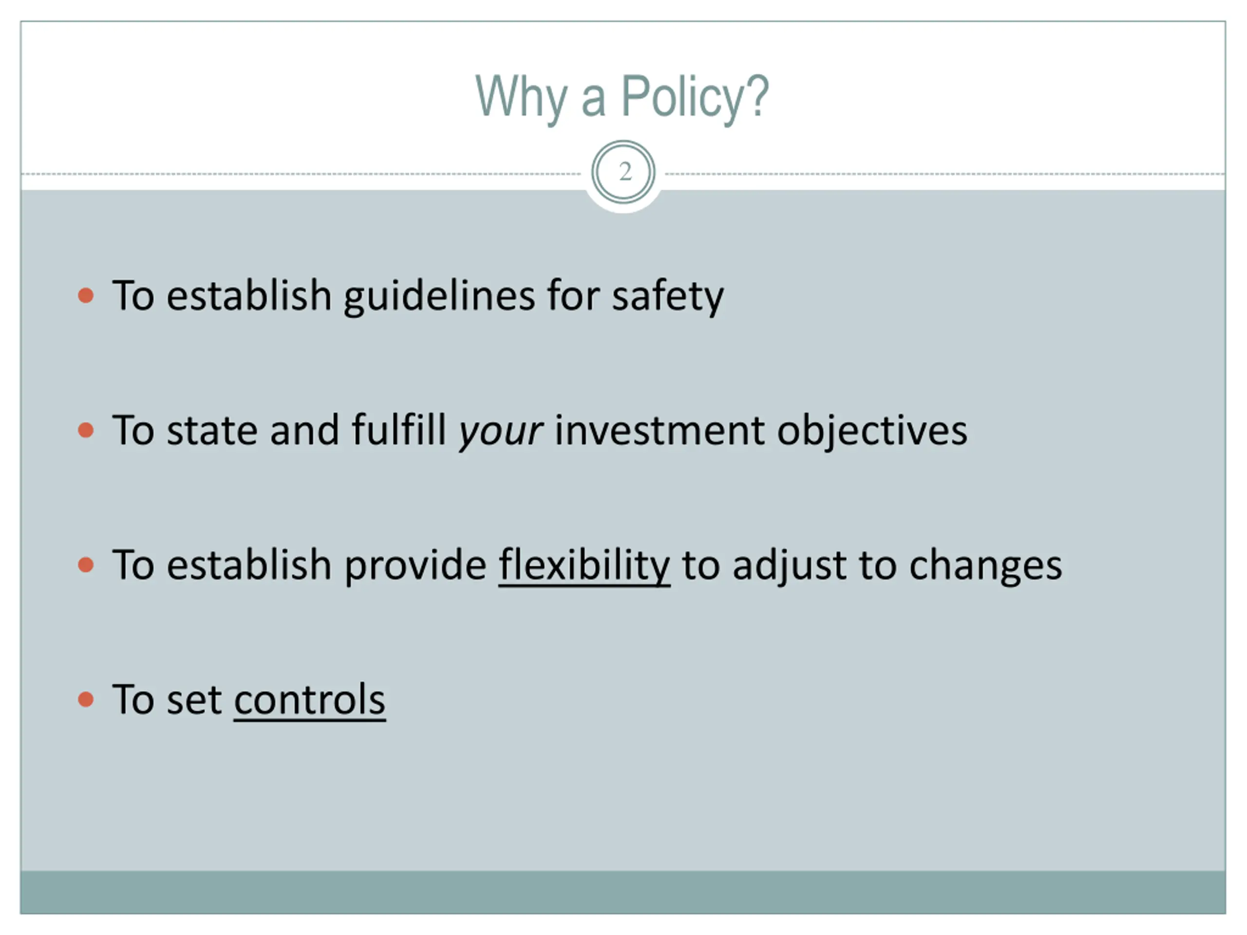 Why a Policy? 2 To establish guidelines for safety To state and fulfill your investment objectives To establish provide flexibility to adjust to changes To set controls