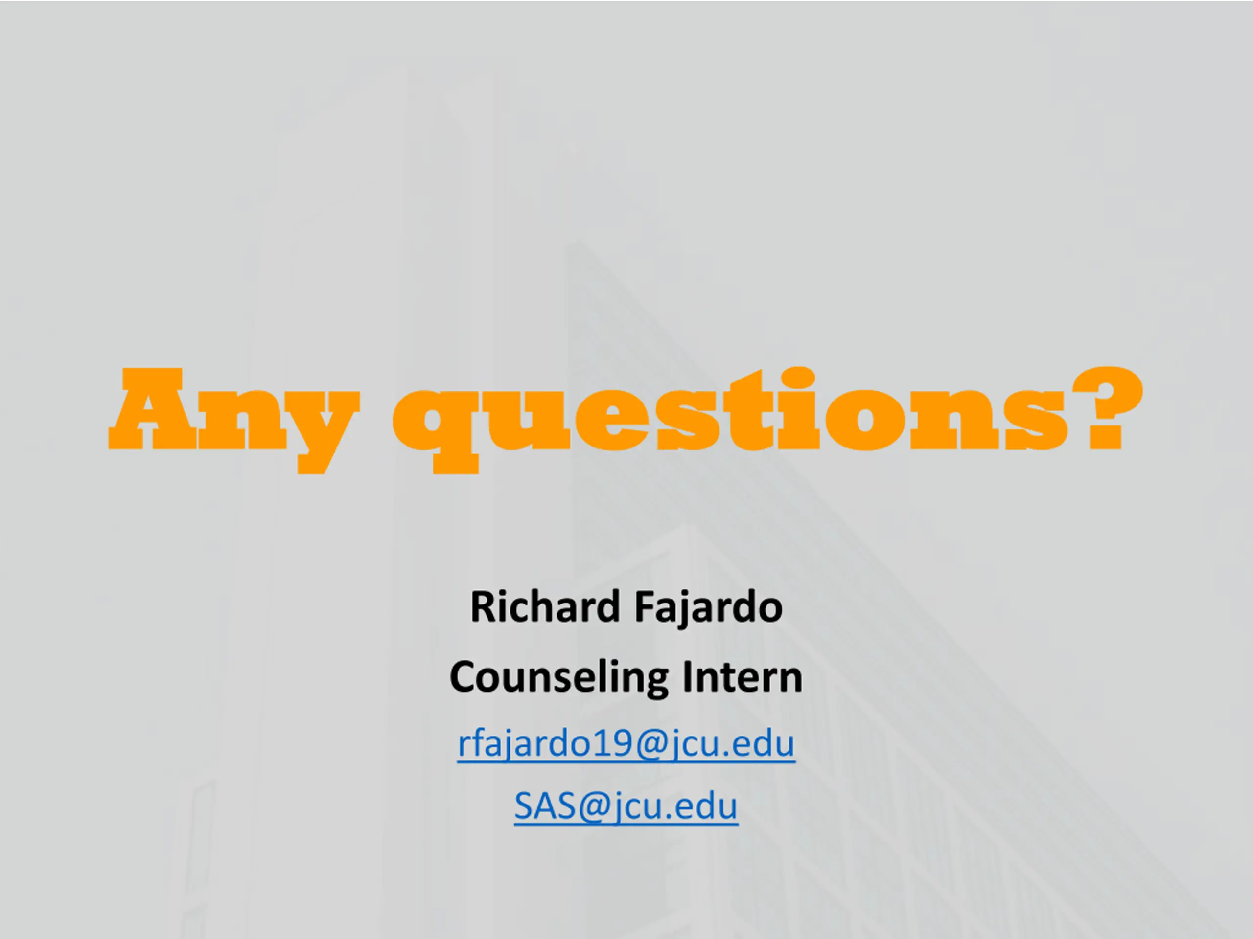 Any questions? Any questions? Richard Fajardo Counseling Intern rfajardo19@jcu.edu SAS@jcu.edu
