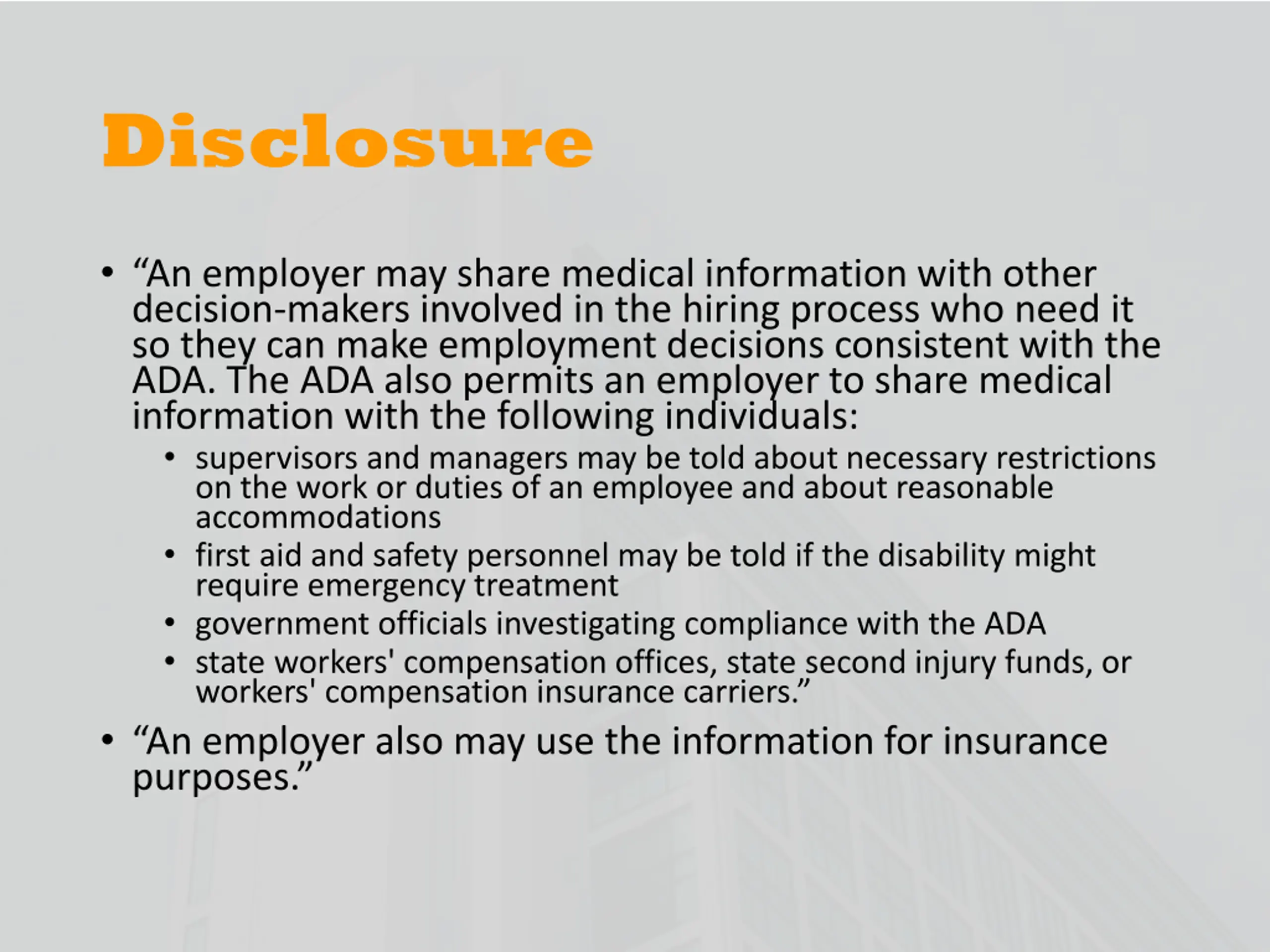 Disclosure An employer may share medical information with other decision-makers involved in the hiring process who need it so they can make employment decisions consistent with the ADA. The ADA also permits an employer to share medical information with the following individuals: supervisors and managers may be told about necessary restrictions on the work or duties of an employee and about reasonable accommodations first aid and safety personnel may be told if the disability might require emergency treatment government officials investigating compliance with the ADA state workers' compensation offices, state second injury funds, or workers' compensation insurance carriers. An employer also may use the information for insurance purposes.