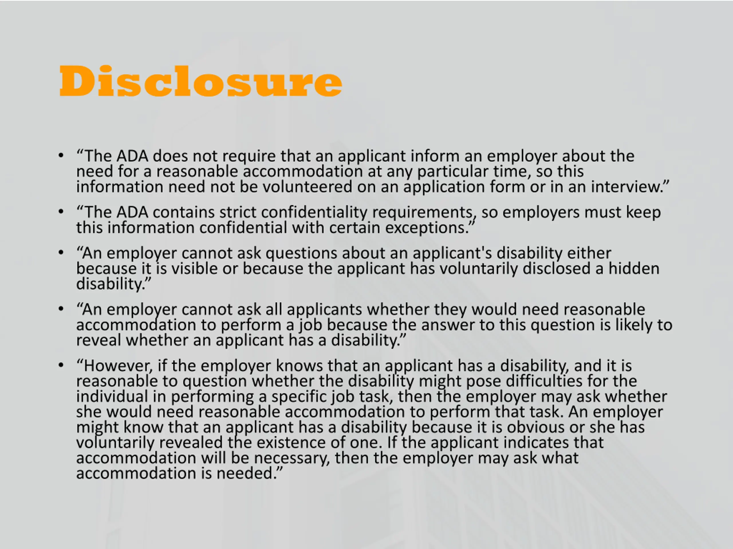 Disclosure The ADA does not require that an applicant inform an employer about the need for a reasonable accommodation at any particular time, so this information need not be volunteered on an application form or in an interview. The ADA contains strict confidentiality requirements, so employers must keep this information confidential with certain exceptions. An employer cannot ask questions about an applicant's disability either because it is visible or because the applicant has voluntarily disclosed a hidden disability. An employer cannot ask all applicants whether they would need reasonable accommodation to perform a job because the answer to this question is likely to reveal whether an applicant has a disability. However, if the employer knows that an applicant has a disability, and it is reasonable to question whether the disability might pose difficulties for the individual in performing a specific job task, then the employer may ask whether she would need reasonable accommodation to perform that task. An employer might know that an applicant has a disability because it is obvious or she has voluntarily revealed the existence of one. If the applicant indicates that accommodation will be necessary, then the employer may ask what accommodation is needed.