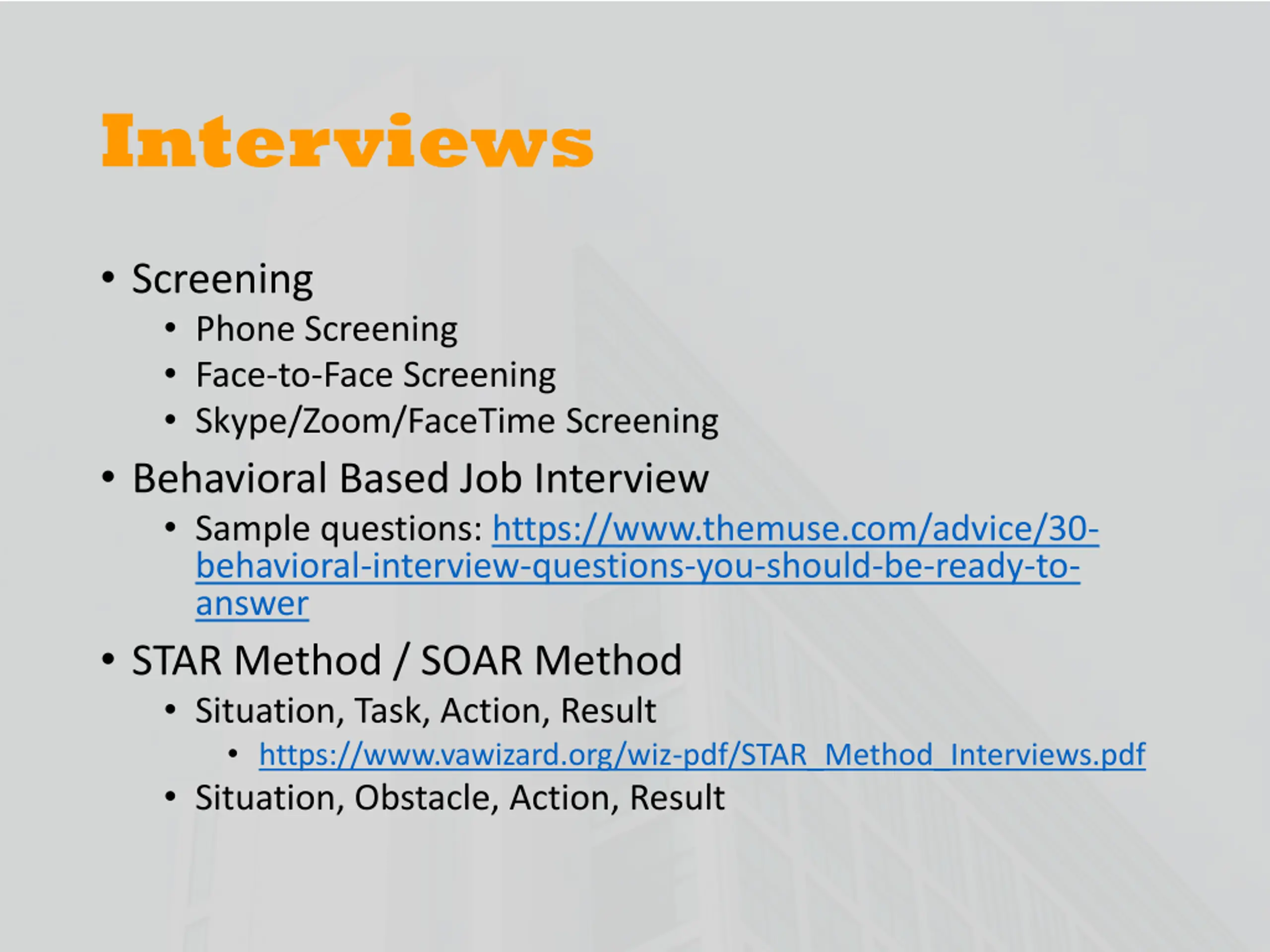 Interviews Screening Phone Screening Face-to-Face Screening Skype/Zoom/FaceTime Screening Behavioral Based Job Interview Sample questions: https://www.themuse.com/advice/30- behavioral-interview-questions-you-should-be-ready-to- answer STAR Method / SOAR Method Situation, Task, Action, Result https://www.vawizard.org/wiz-pdf/STAR_Method_Interviews.pdf Situation, Obstacle, Action, Result