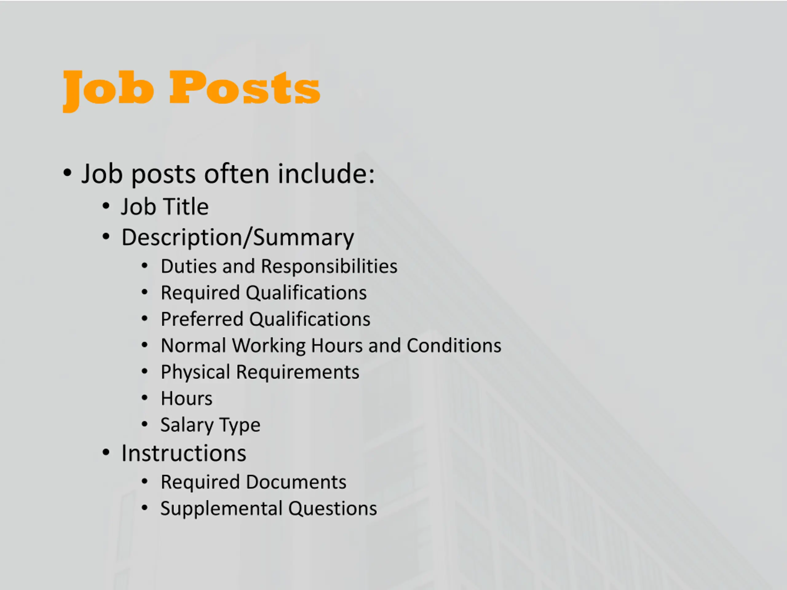 Job Posts Job posts often include: Job Title Description/Summary Duties and Responsibilities Required Qualifications Preferred Qualifications Normal Working Hours and Conditions Physical Requirements Hours Salary Type Instructions Required Documents Supplemental Questions