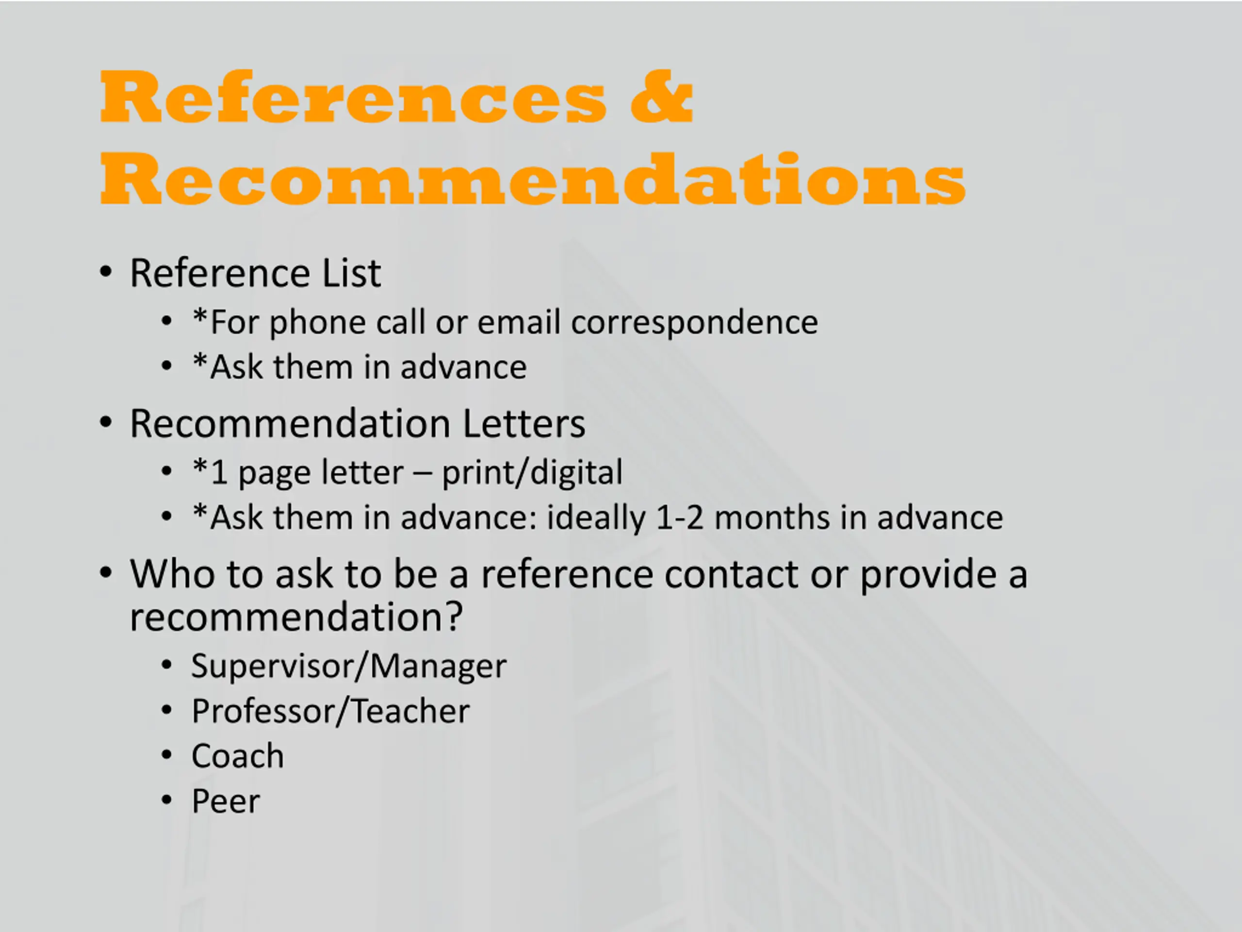 References & Recommendations Reference List *For phone call or email correspondence *Ask them in advance Recommendation Letters *1 page letter print/digital *Ask them in advance: ideally 1-2 months in advance Who to ask to be a reference contact or provide a recommendation? Supervisor/Manager Professor/Teacher Coach Peer