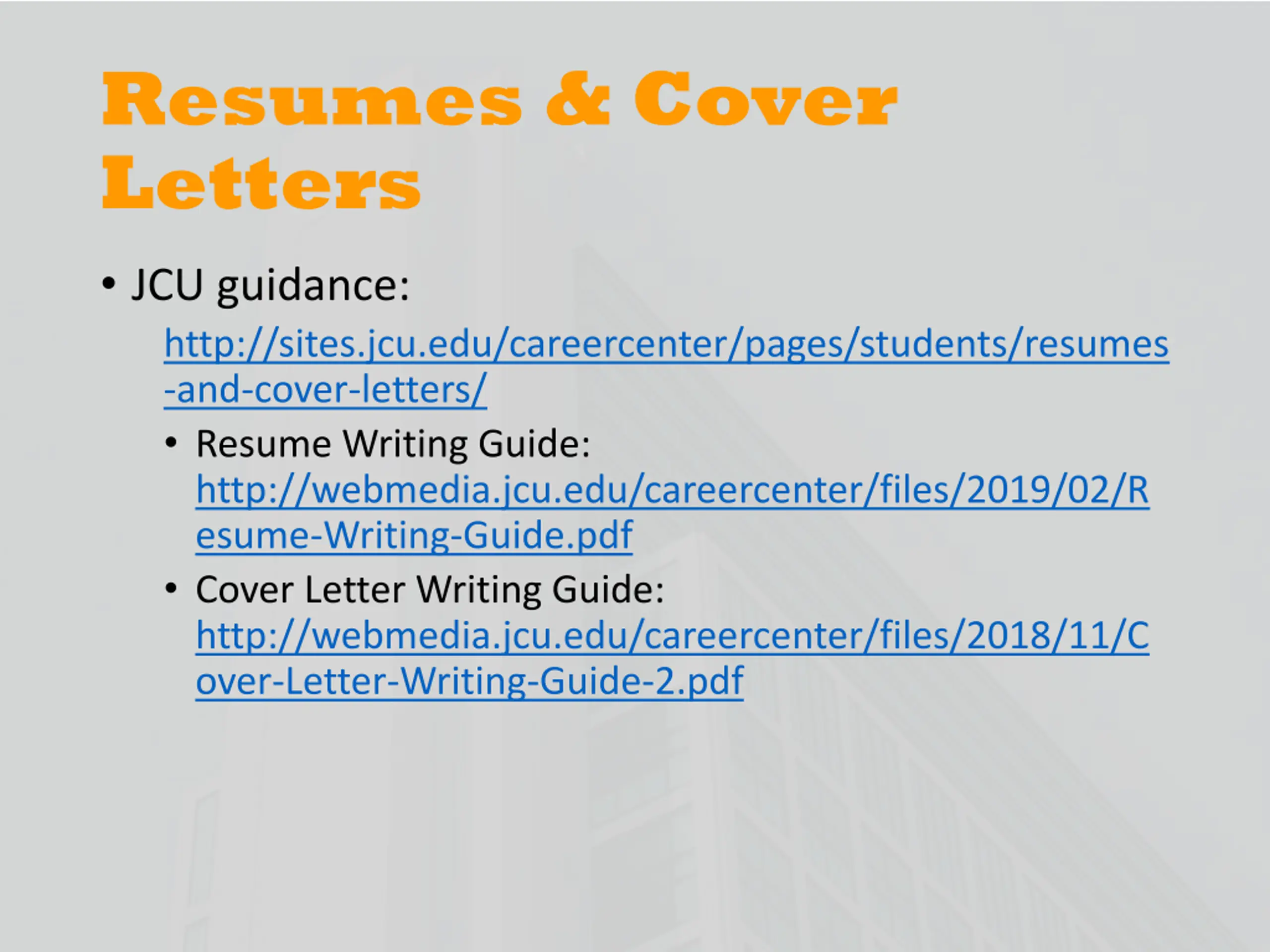 Resumes & Cover Letters JCU guidance: http://sites.jcu.edu/careercenter/pages/students/resumes -and-cover-letters/ Resume Writing Guide: http://webmedia.jcu.edu/careercenter/files/2019/02/R esume-Writing-Guide.pdf Cover Letter Writing Guide: http://webmedia.jcu.edu/careercenter/files/2018/11/C over-Letter-Writing-Guide-2.pdf