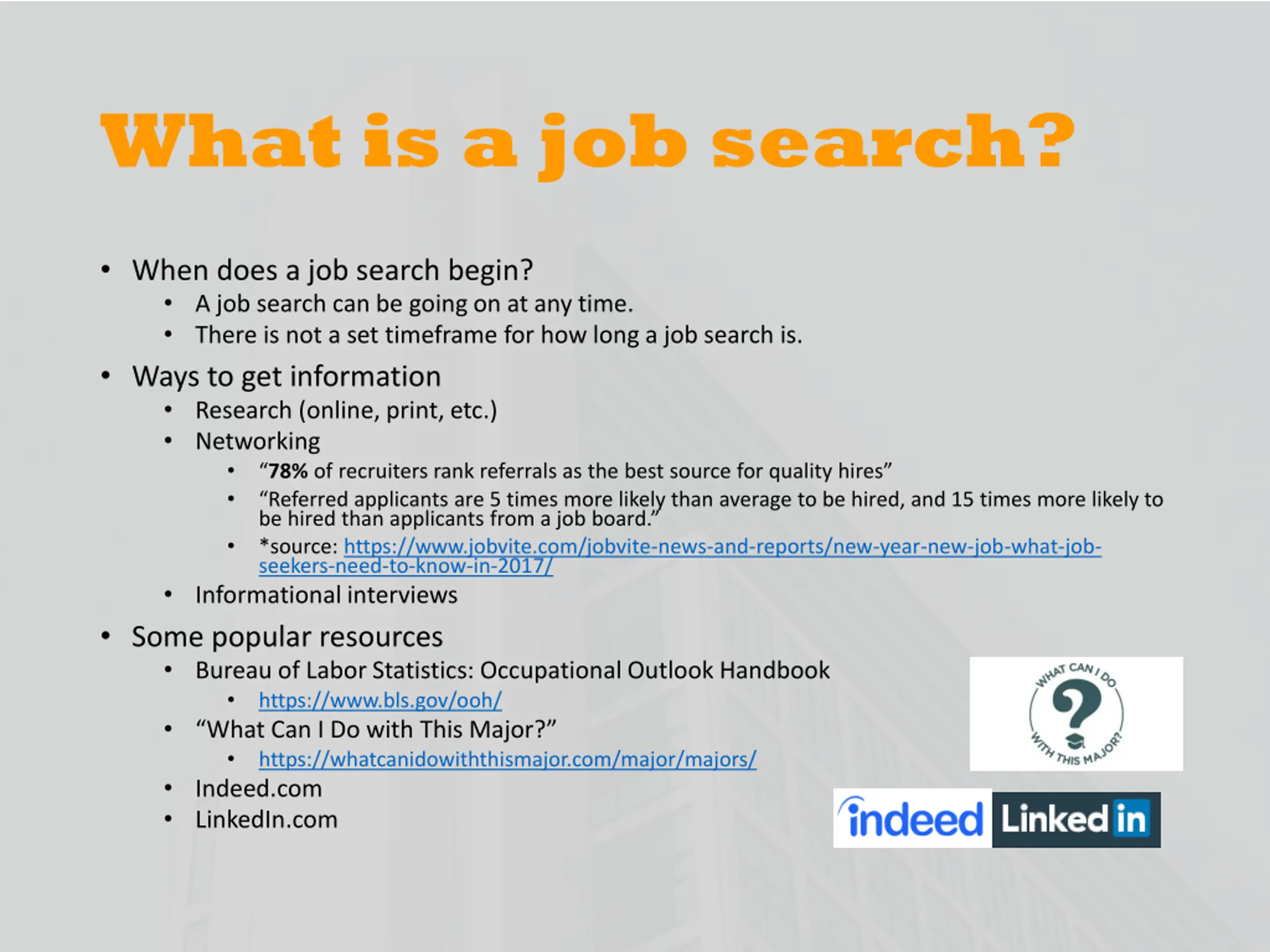 What is a job search? When does a job search begin? A job search can be going on at any time. There is not a set timeframe for how long a job search is. Ways to get information Research (online, print, etc.) Networking 78% of recruiters rank referrals as the best source for quality hires Referred applicants are 5 times more likely than average to be hired, and 15 times more likely to be hired than applicants from a job board. *source: https://www.jobvite.com/jobvite-news-and-reports/new-year-new-job-what-job- seekers-need-to-know-in-2017/ Informational interviews Some popular resources Bureau of Labor Statistics: Occupational Outlook Handbook https://www.bls.gov/ooh/ What Can I Do with This Major? https://whatcanidowiththismajor.com/major/majors/ Indeed.com LinkedIn.com