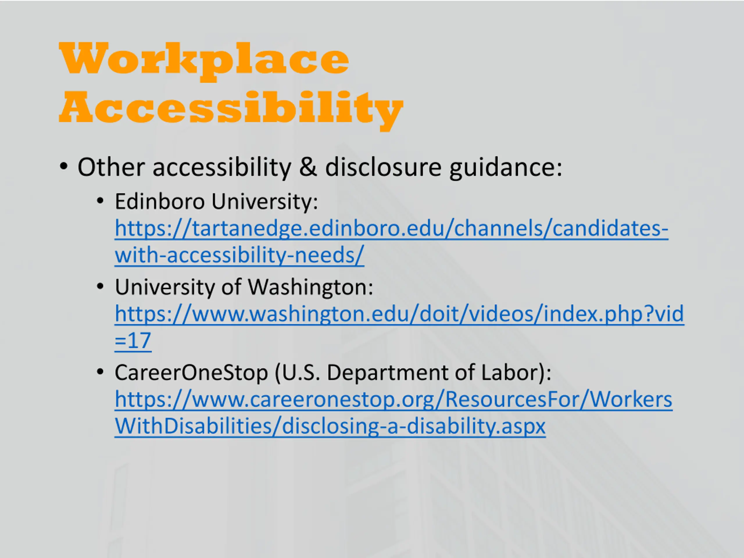 Workplace Accessibility Other accessibility & disclosure guidance: Edinboro University: https://tartanedge.edinboro.edu/channels/candidates- with-accessibility-needs/ University of Washington: https://www.washington.edu/doit/videos/index.php?vid =17 CareerOneStop (U.S. Department of Labor): https://www.careeronestop.org/ResourcesFor/Workers WithDisabilities/disclosing-a-disability.aspx