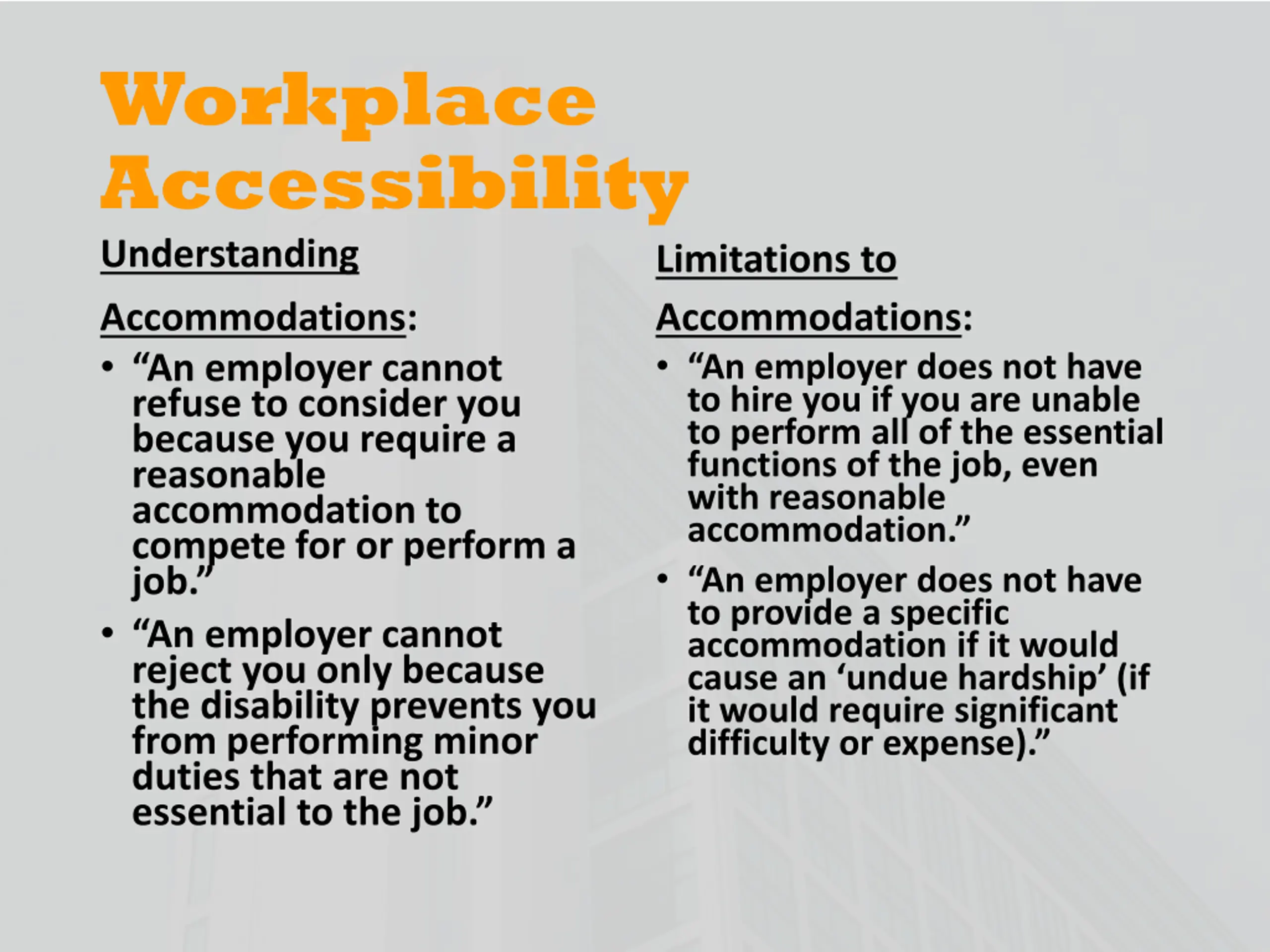 Workplace Accessibility Understanding Limitations to Accommodations: An employer does not have to hire you if you are unable to perform all of the essential functions of the job, even with reasonable accommodation. An employer does not have to provide a specific accommodation if it would cause an undue hardship (if it would require significant difficulty or expense). Accommodations: An employer cannot refuse to consider you because you require a reasonable accommodation to compete for or perform a job. An employer cannot reject you only because the disability prevents you from performing minor duties that are not essential to the job.