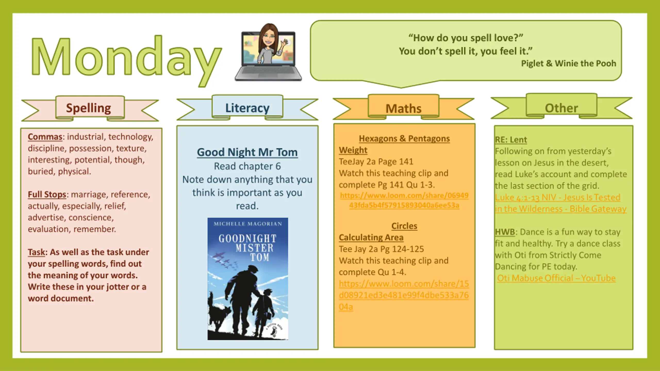 How do you spell love? You don t spell it, you feel it. Monday Piglet & Winie the Pooh He Spelling Literacy Other Maths Commas: industrial, technology, discipline, possession, texture, interesting, potential, though, buried, physical. Hexagons & Pentagons Weight TeeJay 2a Page 141 Watch this teaching clip and complete Pg 141 Qu 1-3. https://www.loom.com/share/06949 43fda5b4f57915893040a6ee53a RE: Lent Following on from yesterday s lesson on Jesus in the desert, read Luke s account and complete the last section of the grid. Luke 4:1-13 NIV - Jesus Is Tested in the Wilderness - Bible Gateway Good Night Mr Tom Read chapter 6 Note down anything that you think is important as you read. Full Stops: marriage, reference, actually, especially, relief, advertise, conscience, evaluation, remember. Circles HWB: Dance is a fun way to stay fit and healthy. Try a dance class with Oti from Strictly Come Dancing for PE today. Oti Mabuse Official YouTube Calculating Area Tee Jay 2a Pg 124-125 Watch this teaching clip and complete Qu 1-4. https://www.loom.com/share/15 d08921ed3e481e99f4dbe533a76 04a Task: As well as the task under your spelling words, find out the meaning of your words. Write these in your jotter or a word document.