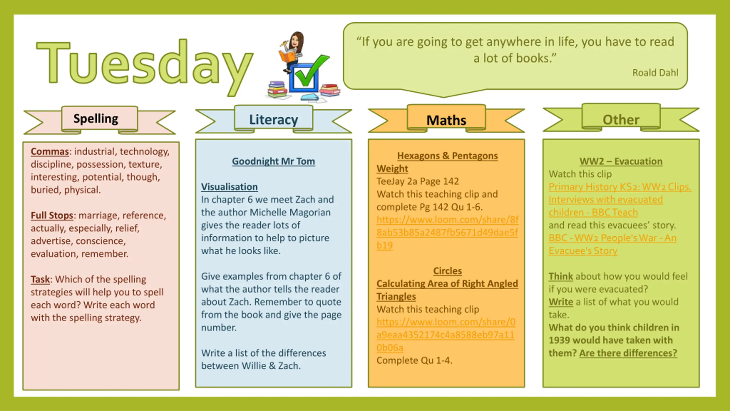 If you are going to get anywhere in life, you have to read a lot of books. Tuesday Roald Dahl Spelling Literacy Other Maths Commas: industrial, technology, discipline, possession, texture, interesting, potential, though, buried, physical. Hexagons & Pentagons Weight TeeJay 2a Page 142 Watch this teaching clip and complete Pg 142 Qu 1-6. https://www.loom.com/share/8f 8ab53b85a2487fb5671d49dae5f b19 Goodnight Mr Tom WW2 Evacuation Watch this clip Primary History KS2: WW2 Clips. Interviews with evacuated children - BBC Teach and read this evacuees story. BBC - WW2 People's War - An Evacuee's Story Visualisation In chapter 6 we meet Zach and the author Michelle Magorian gives the reader lots of information to help to picture what he looks like. Full Stops: marriage, reference, actually, especially, relief, advertise, conscience, evaluation, remember. Circles Give examples from chapter 6 of what the author tells the reader about Zach. Remember to quote from the book and give the page number. Think about how you would feel if you were evacuated? Write a list of what you would take. What do you think children in 1939 would have taken with them? Are there differences? Task: Which of the spelling strategies will help you to spell each word? Write each word with the spelling strategy. Calculating Area of Right Angled Triangles Watch this teaching clip https://www.loom.com/share/0 a9eaa4352174c4a8588eb97a11 0b06a Complete Qu 1-4. Write a list of the differences between Willie & Zach.