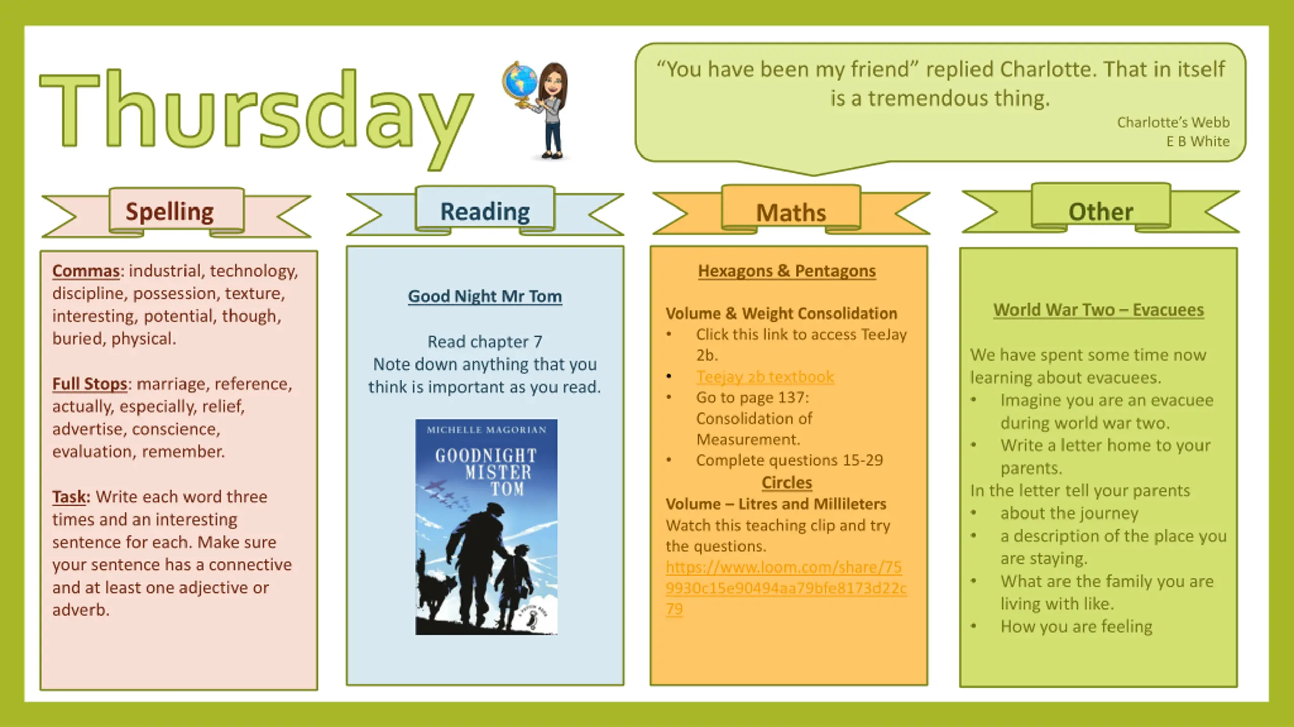 You have been my friend replied Charlotte. That in itself is a tremendous thing. Thursday Charlotte s Webb E B White Spelling Reading Other Maths Commas: industrial, technology, discipline, possession, texture, interesting, potential, though, buried, physical. Hexagons & Pentagons Volume & Weight Consolidation Click this link to access TeeJay 2b. Teejay 2b textbook Go to page 137: Consolidation of Measurement. Complete questions 15-29 Circles Volume Litres and Millileters Watch this teaching clip and try the questions. https://www.loom.com/share/75 9930c15e90494aa79bfe8173d22c 79 Good Night Mr Tom World War Two Evacuees Read chapter 7 Note down anything that you think is important as you read. We have spent some time now learning about evacuees. Imagine you are an evacuee during world war two. Write a letter home to your parents. In the letter tell your parents about the journey a description of the place you are staying. What are the family you are living with like. How you are feeling Full Stops: marriage, reference, actually, especially, relief, advertise, conscience, evaluation, remember. Task: Write each word three times and an interesting sentence for each. Make sure your sentence has a connective and at least one adjective or adverb.
