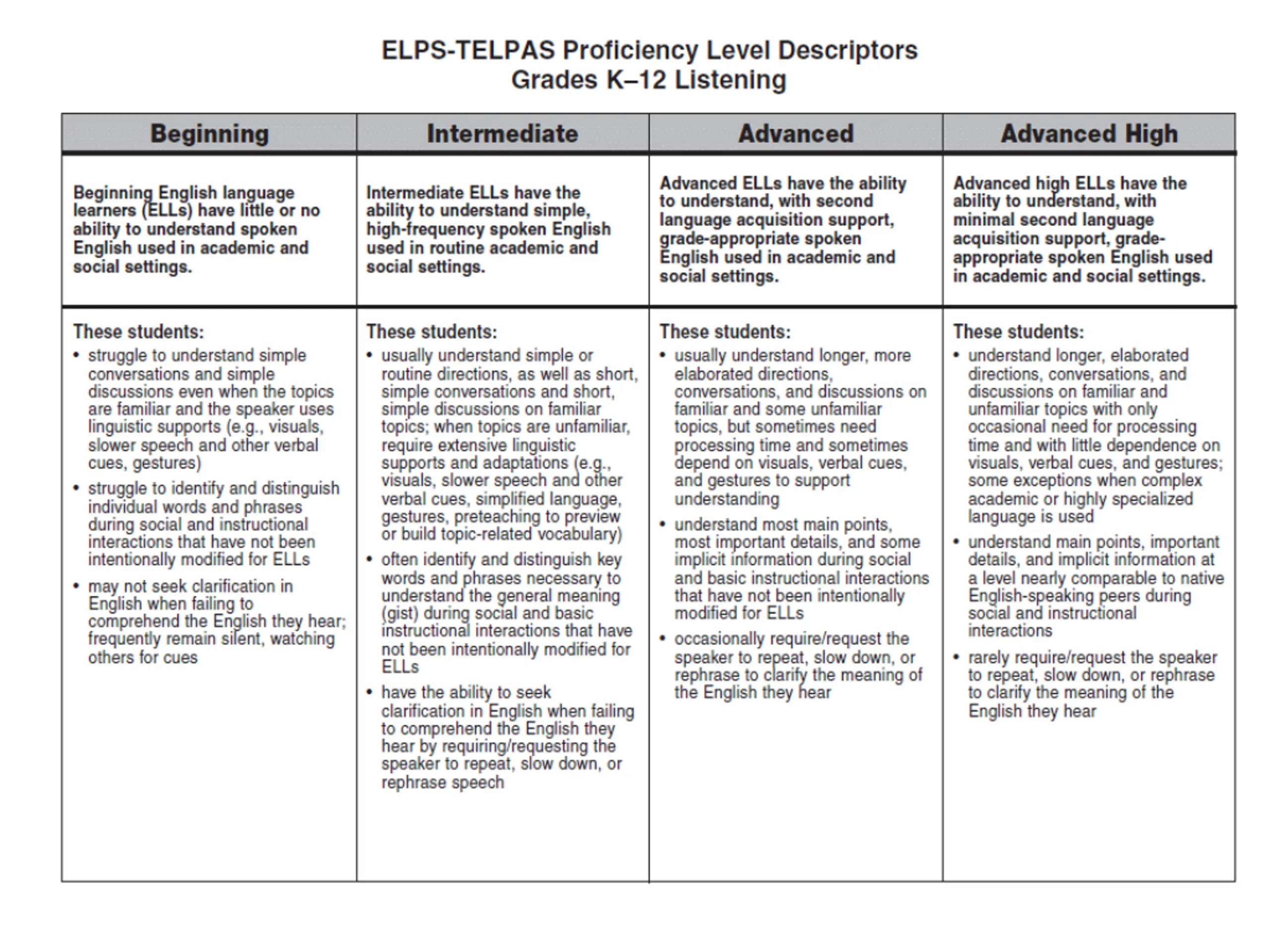 ELPS-TELPAS Proficiency Level Descriptors Grades K 12 Listening