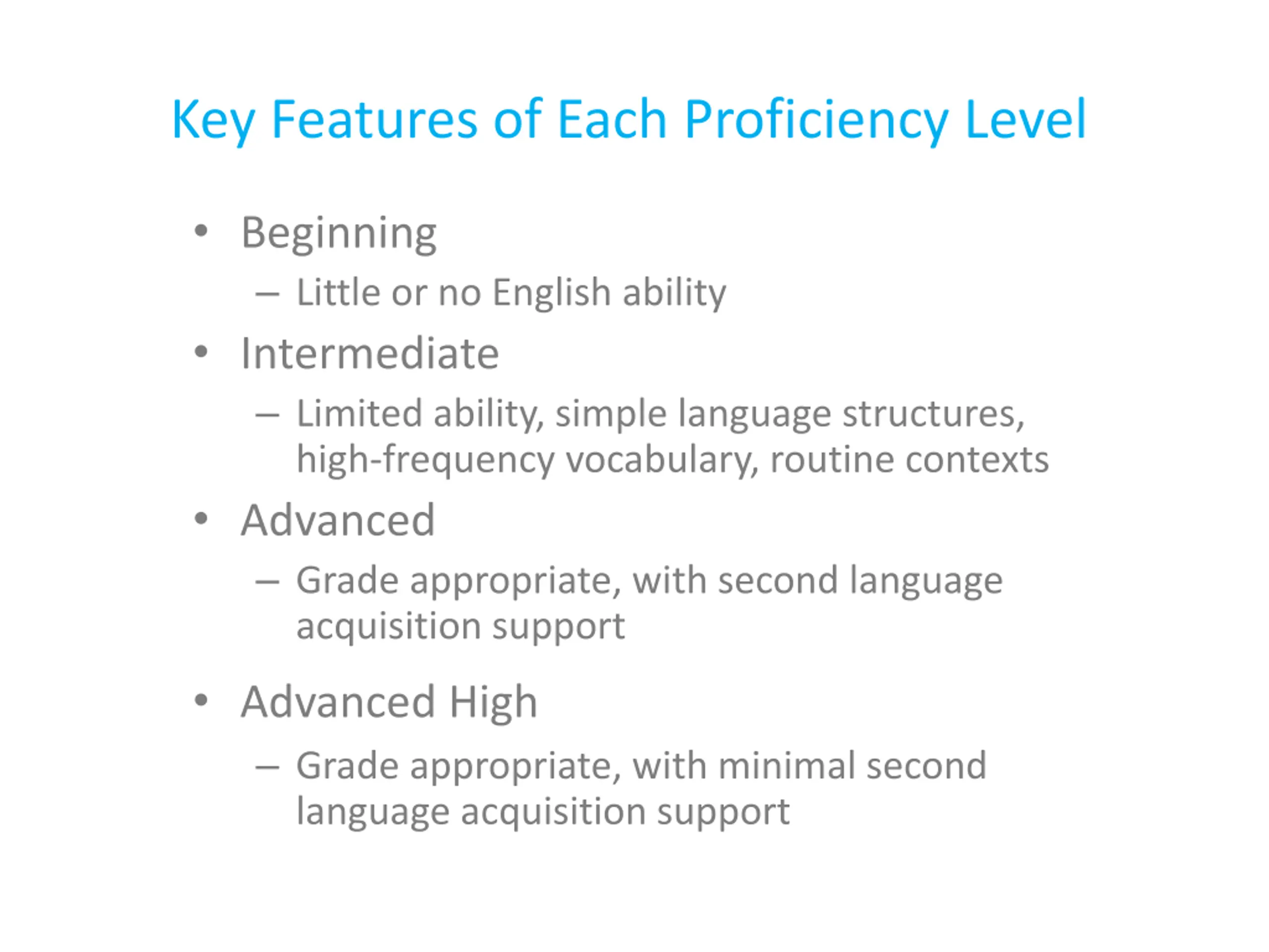 Key Features of Each Proficiency Level Beginning Little or no English ability Intermediate Limited ability, simple language structures, high-frequency vocabulary, routine contexts Advanced Grade appropriate, with second language acquisition support Advanced High Grade appropriate, with minimal second language acquisition support