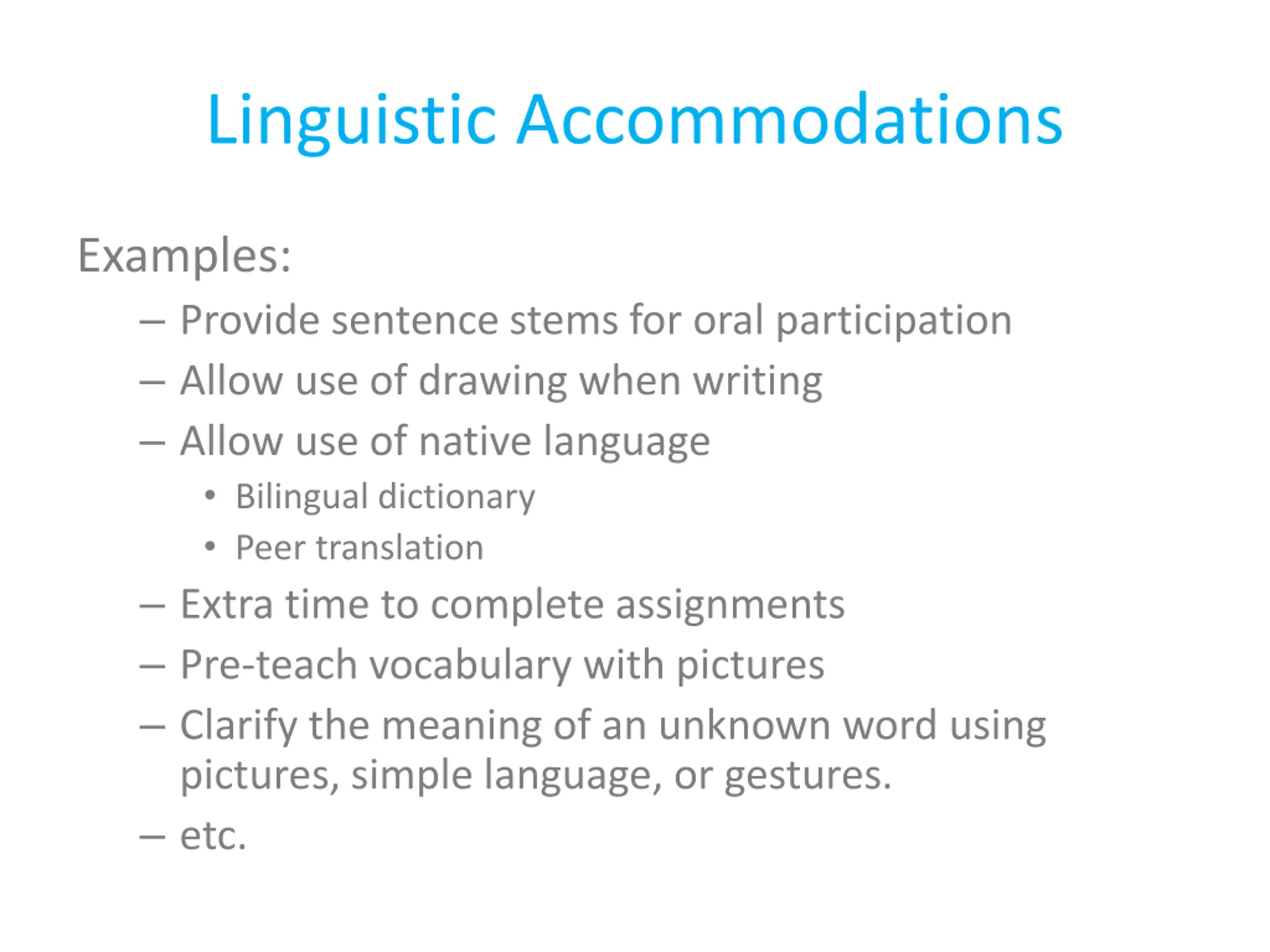 Linguistic Accommodations Examples: Provide sentence stems for oral participation Allow use of drawing when writing Allow use of native language Bilingual dictionary Peer translation Extra time to complete assignments Pre-teach vocabulary with pictures Clarify the meaning of an unknown word using pictures, simple language, or gestures. etc.