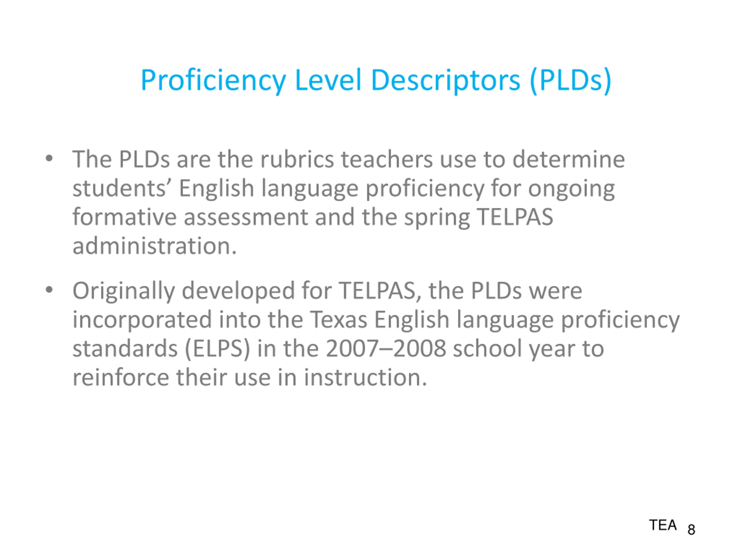 Proficiency Level Descriptors (PLDs) The PLDs are the rubrics teachers use to determine students English language proficiency for ongoing formative assessment and the spring TELPAS administration. Originally developed for TELPAS, the PLDs were incorporated into the Texas English language proficiency standards (ELPS) in the 2007 2008 school year to reinforce their use in instruction. TEA 8