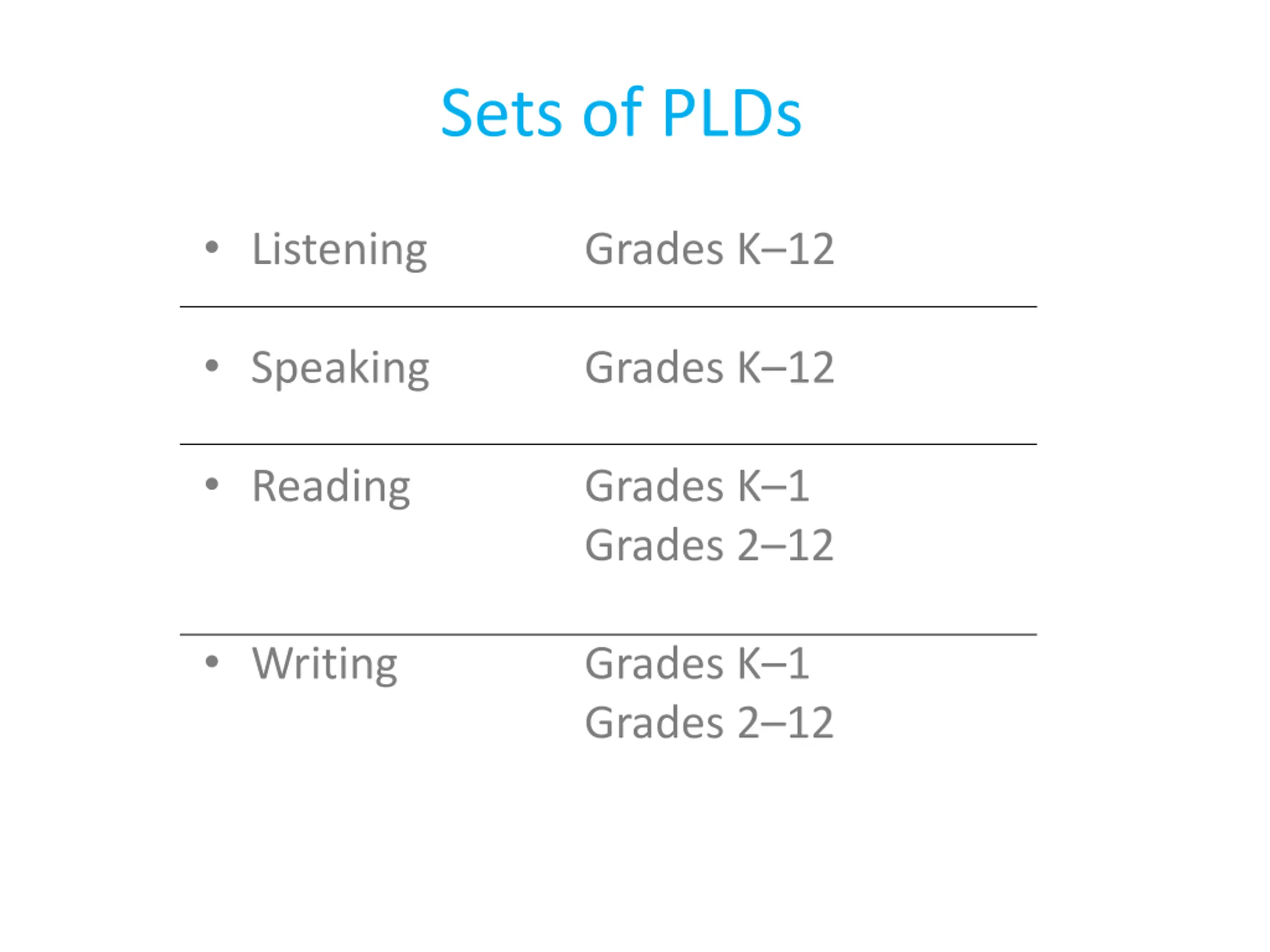 Sets of PLDs Listening Grades K 12 Speaking Grades K 12 Reading Grades K 1 Grades 2 12 Writing Grades K 1 Grades 2 12