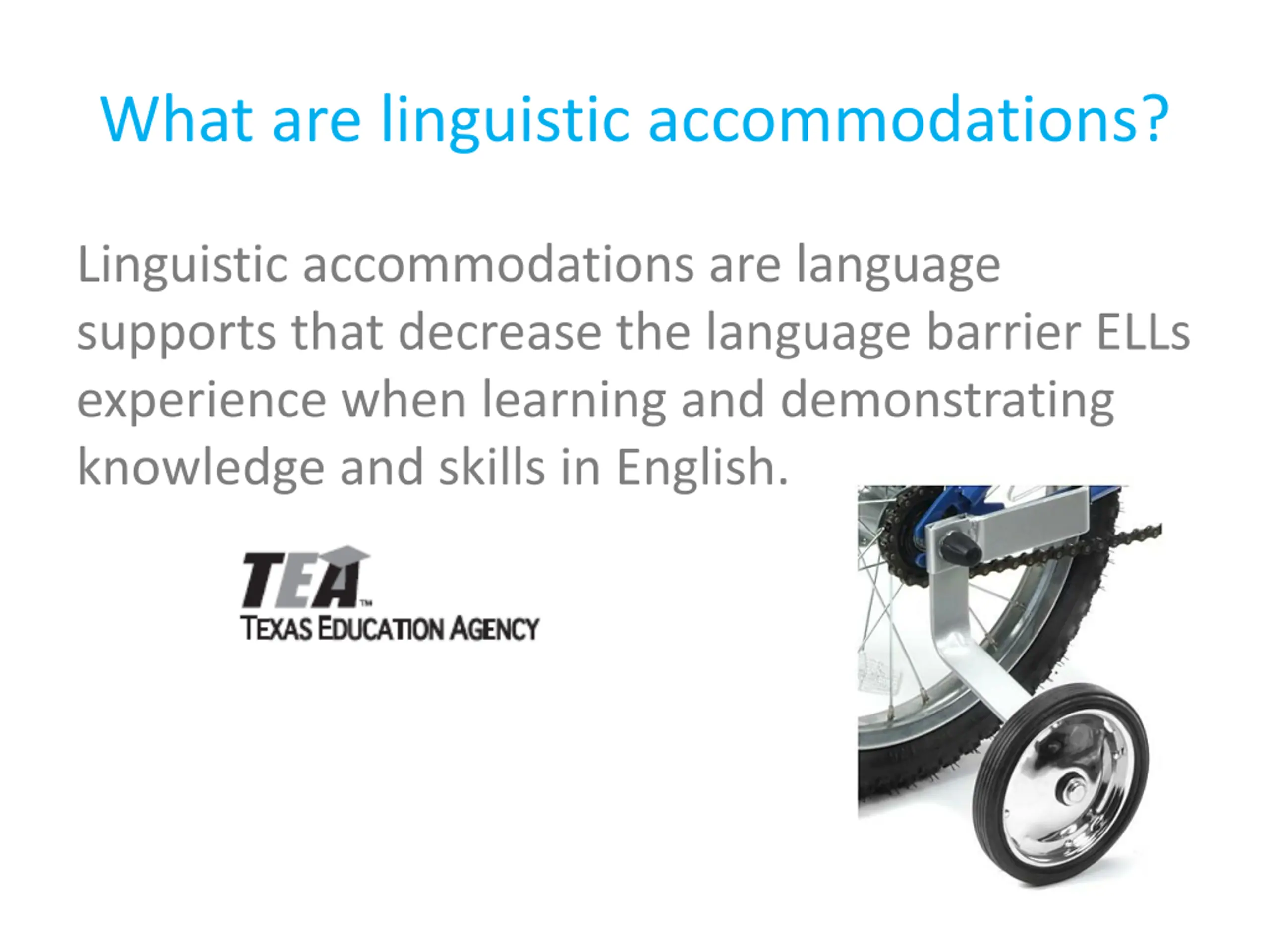 What are linguistic accommodations? Linguistic accommodations are language supports that decrease the language barrier ELLs experience when learning and demonstrating knowledge and skills in English.