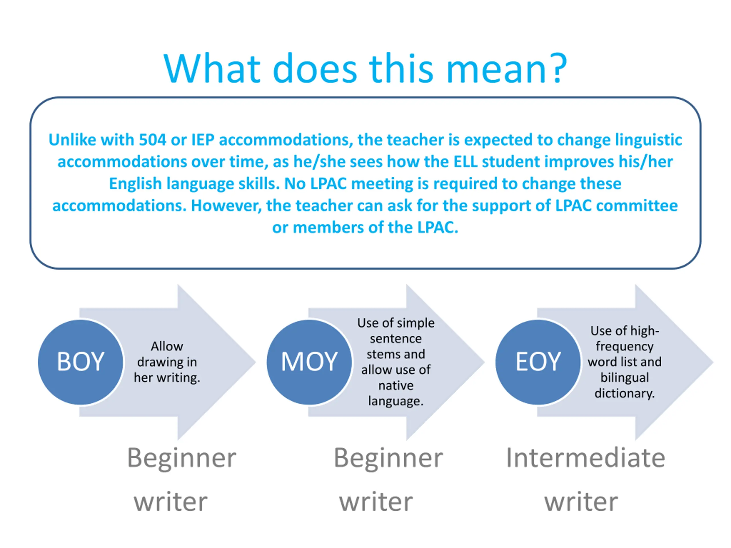 What does this mean? Unlike with 504 or IEP accommodations, the teacher is expected to change linguistic accommodations over time, as he/she sees how the ELL student improves his/her English language skills. No LPAC meeting is required to change these accommodations. However, the teacher can ask for the support of LPAC committee or members of the LPAC. Cho Chang L. Accommodations for writing in classroom. Use of simple sentence stems and allow use of native language. Use of high- frequency word list and bilingual dictionary. Allow drawing in her writing. BOY MOY EOY Beginner Beginner writer writer Intermediate writer