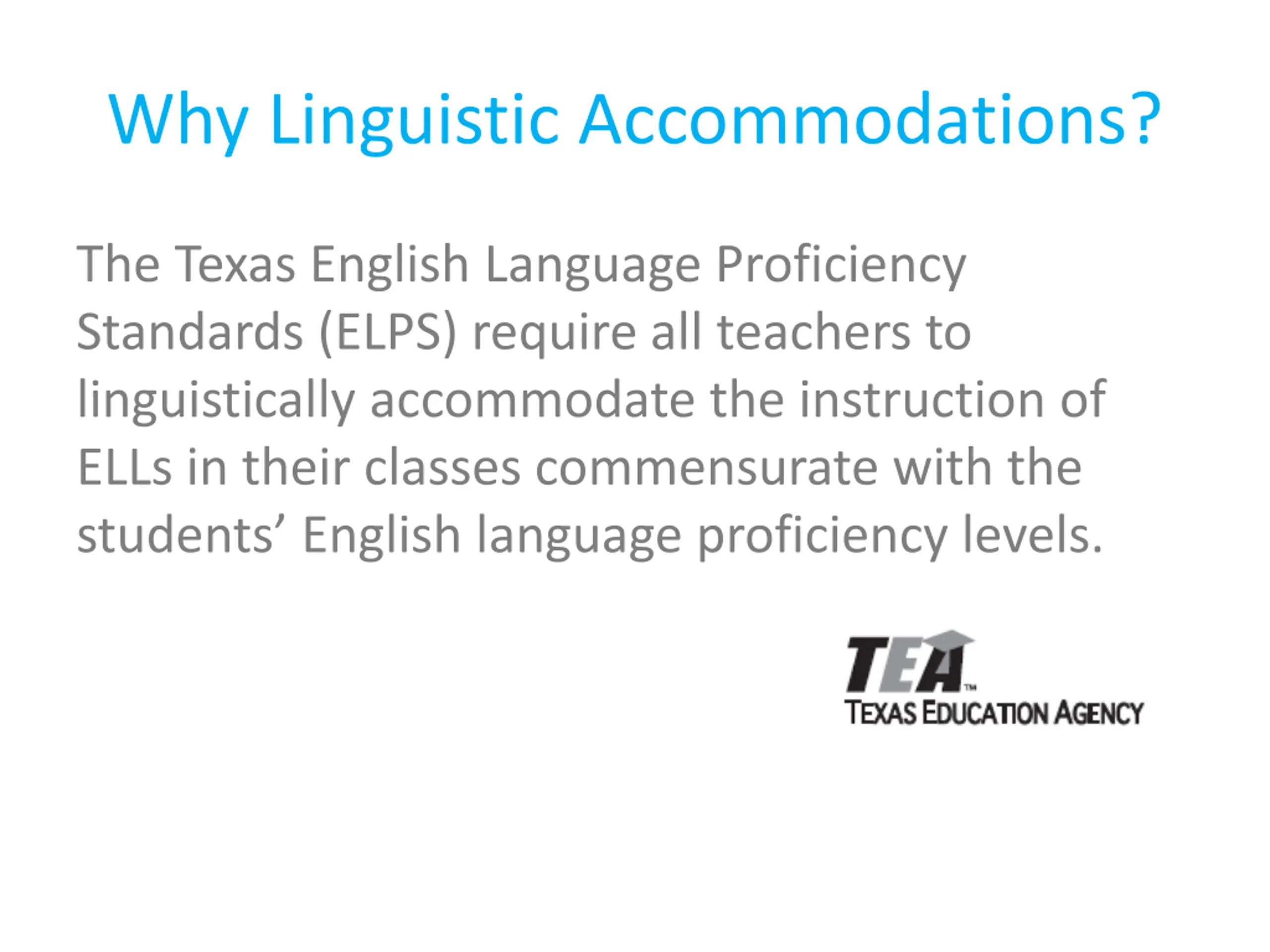 Why Linguistic Accommodations? The Texas English Language Proficiency Standards (ELPS) require all teachers to linguistically accommodate the instruction of ELLs in their classes commensurate with the students English language proficiency levels.