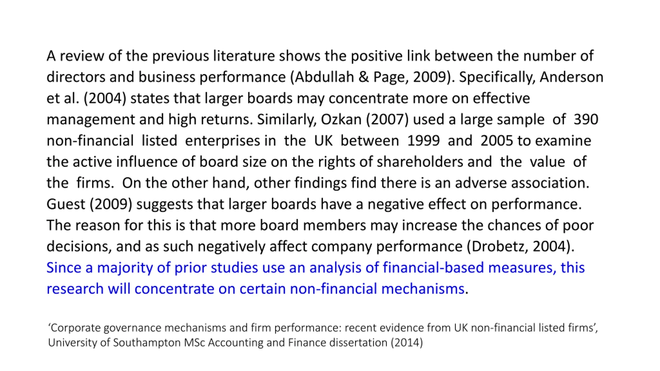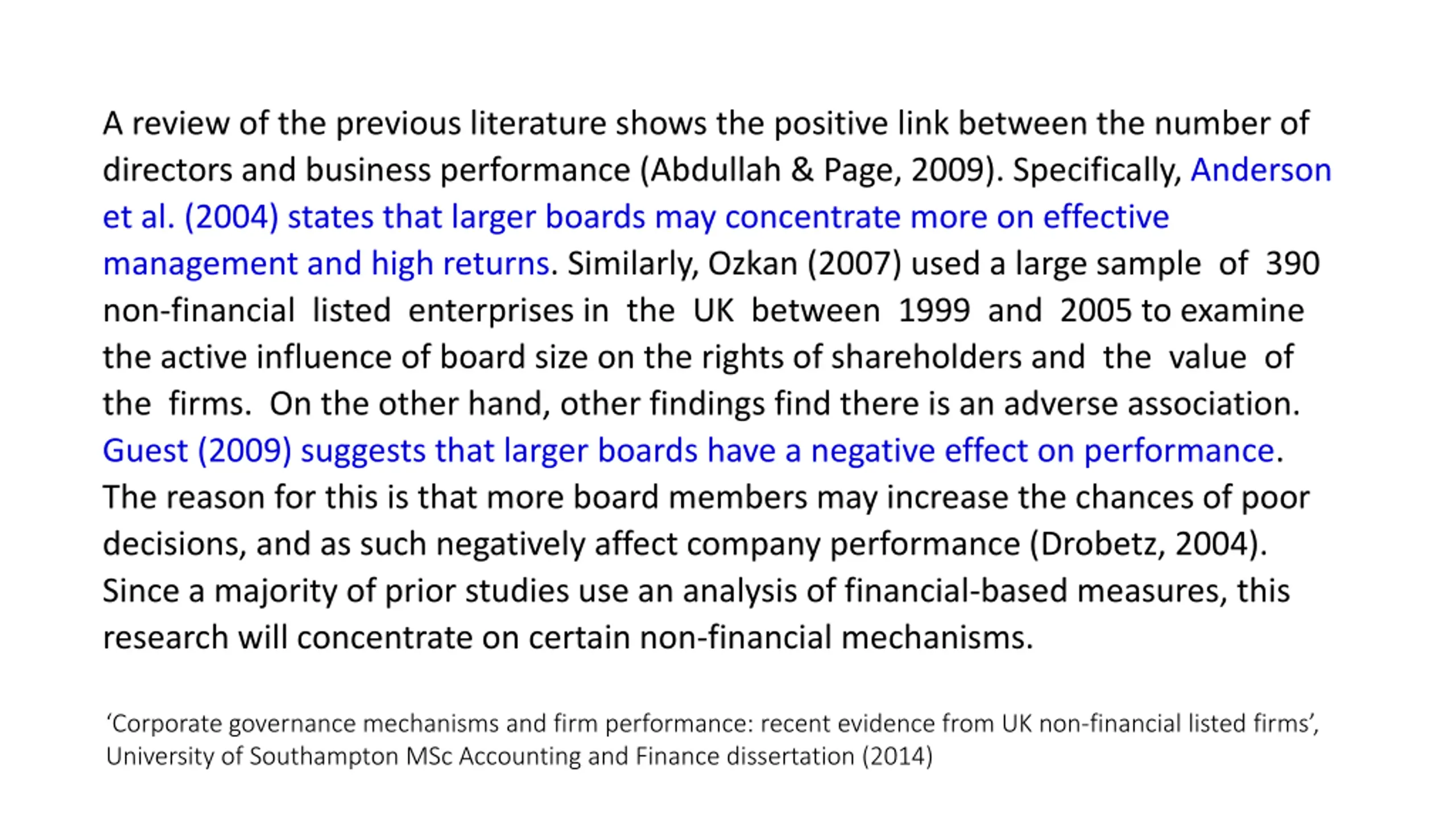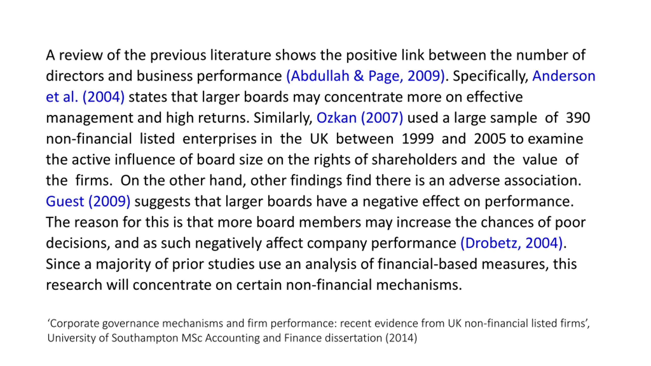 A review of the previous literature shows the positive link between the number of directors and business performance (Abdullah & Page, 2009). Specifically, Anderson et al. (2004) states that larger boards may concentrate more on effective management and high returns. Similarly, Ozkan (2007) used a large sample of 390 non-financial listed enterprises in the UK between 1999 and 2005 to examine the active influence of board size on the rights of shareholders and the value of the firms. On the other hand, other findings find there is an adverse association. Guest (2009) suggests that larger boards have a negative effect on performance. The reason for this is that more board members may increase the chances of poor decisions, and as such negatively affect company performance (Drobetz, 2004). Since a majority of prior studies use an analysis of financial-based measures, this research will concentrate on certain non-financial mechanisms. Corporate governance mechanisms and firm performance: recent evidence from UK non-financial listed firms , University of Southampton MSc Accounting and Finance dissertation (2014)