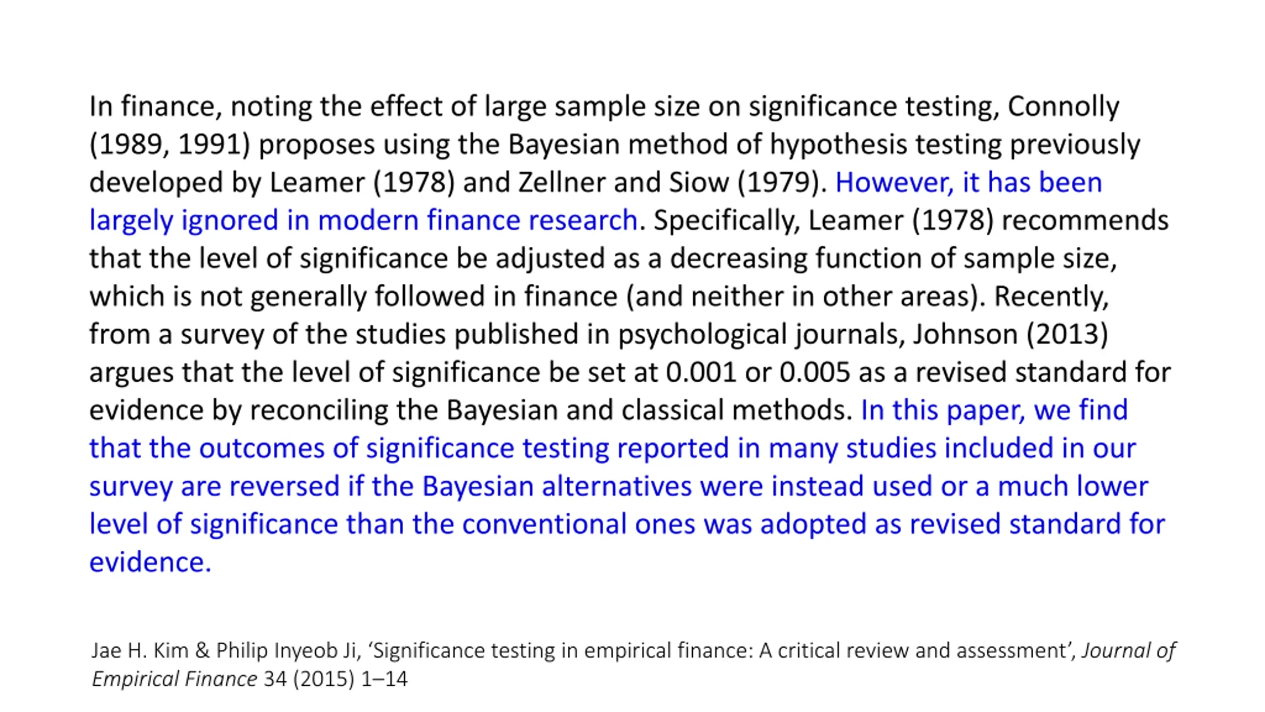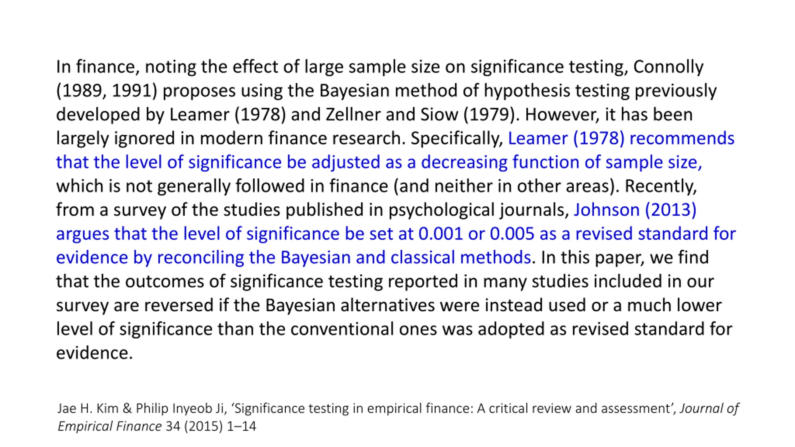 In finance, noting the effect of large sample size on significance testing, Connolly (1989, 1991) proposes using the Bayesian method of hypothesis testing previously developed by Leamer (1978) and Zellner and Siow (1979). However, it has been largely ignored in modern finance research. Specifically, Leamer (1978) recommends that the level of significance be adjusted as a decreasing function of sample size, which is not generally followed in finance (and neither in other areas). Recently, from a survey of the studies published in psychological journals, Johnson (2013) argues that the level of significance be set at 0.001 or 0.005 as a revised standard for evidence by reconciling the Bayesian and classical methods. In this paper, we find that the outcomes of significance testing reported in many studies included in our survey are reversed if the Bayesian alternatives were instead used or a much lower level of significance than the conventional ones was adopted as revised standard for evidence. Jae H. Kim & Philip Inyeob Ji, Significance testing in empirical finance: A critical review and assessment , Journal of Empirical Finance 34 (2015) 1 14