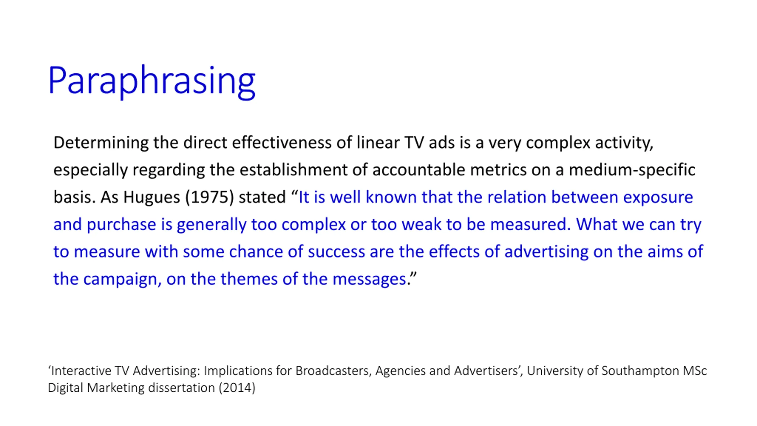 Paraphrasing Determining the direct effectiveness of linear TV ads is a very complex activity, especially regarding the establishment of accountable metrics on a medium-specific basis. As Hugues (1975) stated It is well known that the relation between exposure and purchase is generally too complex or too weak to be measured. What we can try to measure with some chance of success are the effects of advertising on the aims of the campaign, on the themes of the messages. Interactive TV Advertising: Implications for Broadcasters, Agencies and Advertisers , University of Southampton MSc Digital Marketing dissertation (2014)