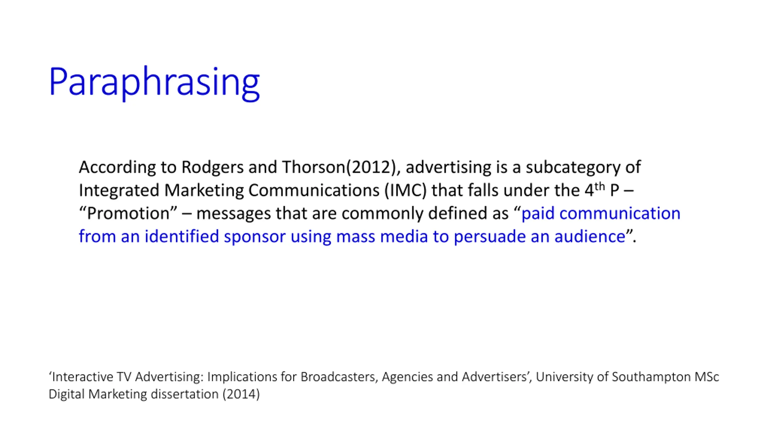 Paraphrasing According to Rodgers and Thorson(2012), advertising is a subcategory of Integrated Marketing Communications (IMC) that falls under the 4th P Promotion messages that are commonly defined as paid communication from an identified sponsor using mass media to persuade an audience . Interactive TV Advertising: Implications for Broadcasters, Agencies and Advertisers , University of Southampton MSc Digital Marketing dissertation (2014)