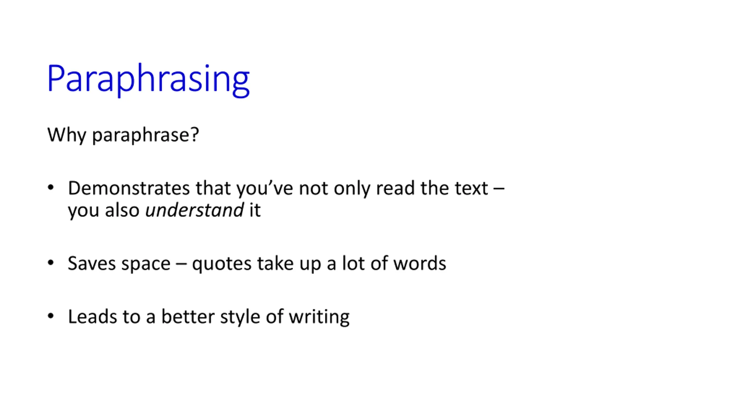 Paraphrasing Why paraphrase? Demonstrates that you ve not only read the text you also understand it Saves space quotes take up a lot of words Leads to a better style of writing