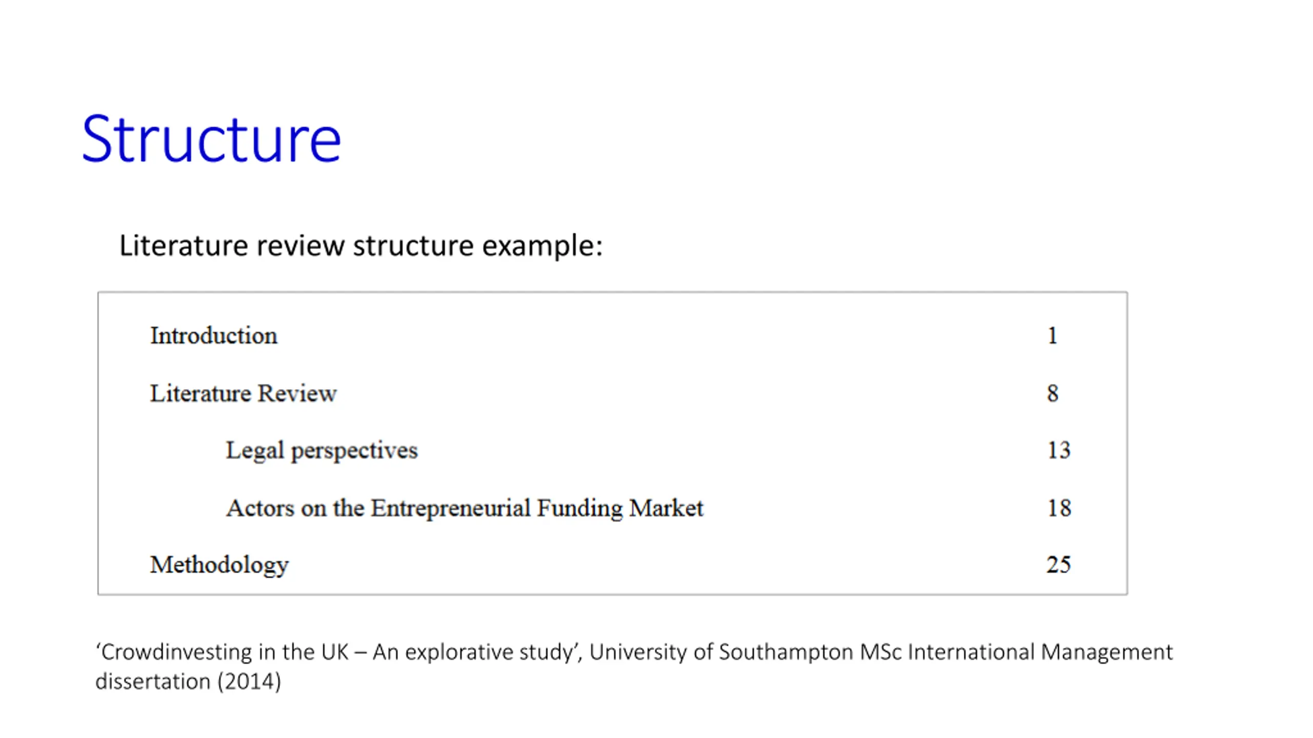 Structure Literature review structure example: Crowdinvesting in the UK An explorative study , University of Southampton MSc International Management dissertation (2014)