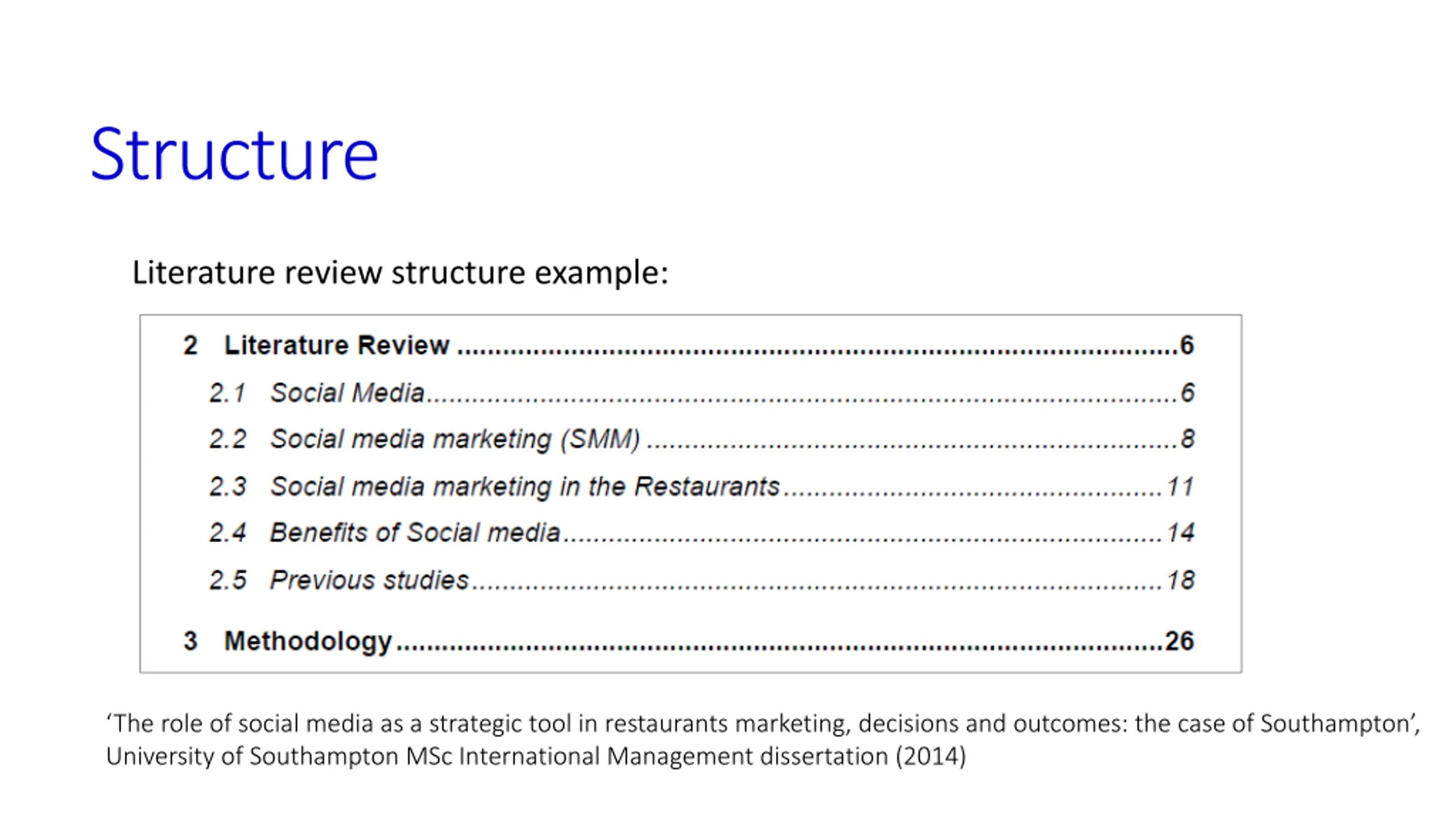 Structure Literature review structure example: The role of social media as a strategic tool in restaurants marketing, decisions and outcomes: the case of Southampton , University of Southampton MSc International Management dissertation (2014)