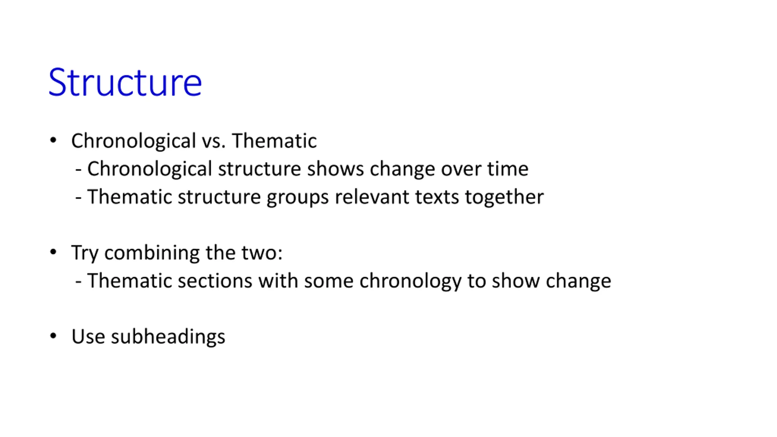 Structure Chronological vs. Thematic - Chronological structure shows change over time - Thematic structure groups relevant texts together Try combining the two: - Thematic sections with some chronology to show change Use subheadings