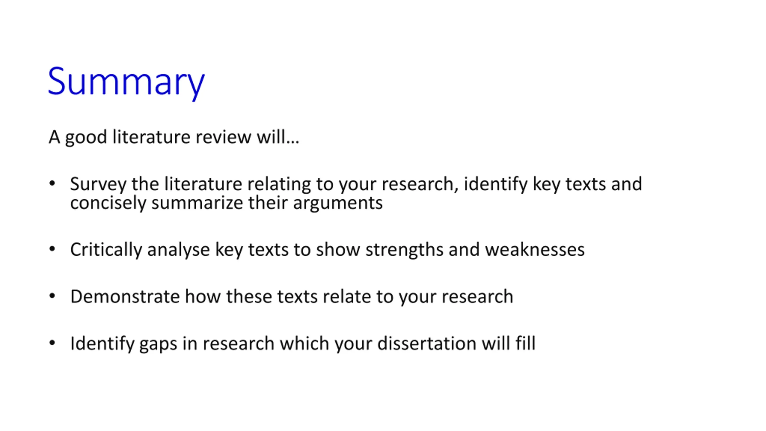 Summary A good literature review will Survey the literature relating to your research, identify key texts and concisely summarize their arguments Critically analyse key texts to show strengths and weaknesses Demonstrate how these texts relate to your research Identify gaps in research which your dissertation will fill