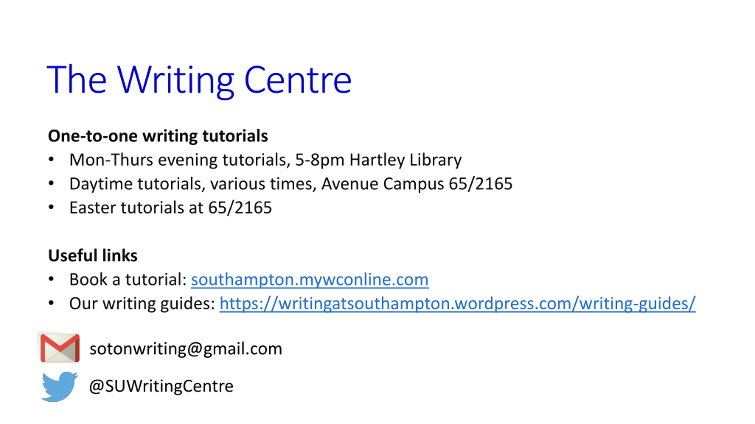 The Writing Centre One-to-one writing tutorials Mon-Thurs evening tutorials, 5-8pm Hartley Library Daytime tutorials, various times, Avenue Campus 65/2165 Easter tutorials at 65/2165 Useful links Book a tutorial: southampton.mywconline.com Our writing guides: https://writingatsouthampton.wordpress.com/writing-guides/ sotonwriting@gmail.com @SUWritingCentre
