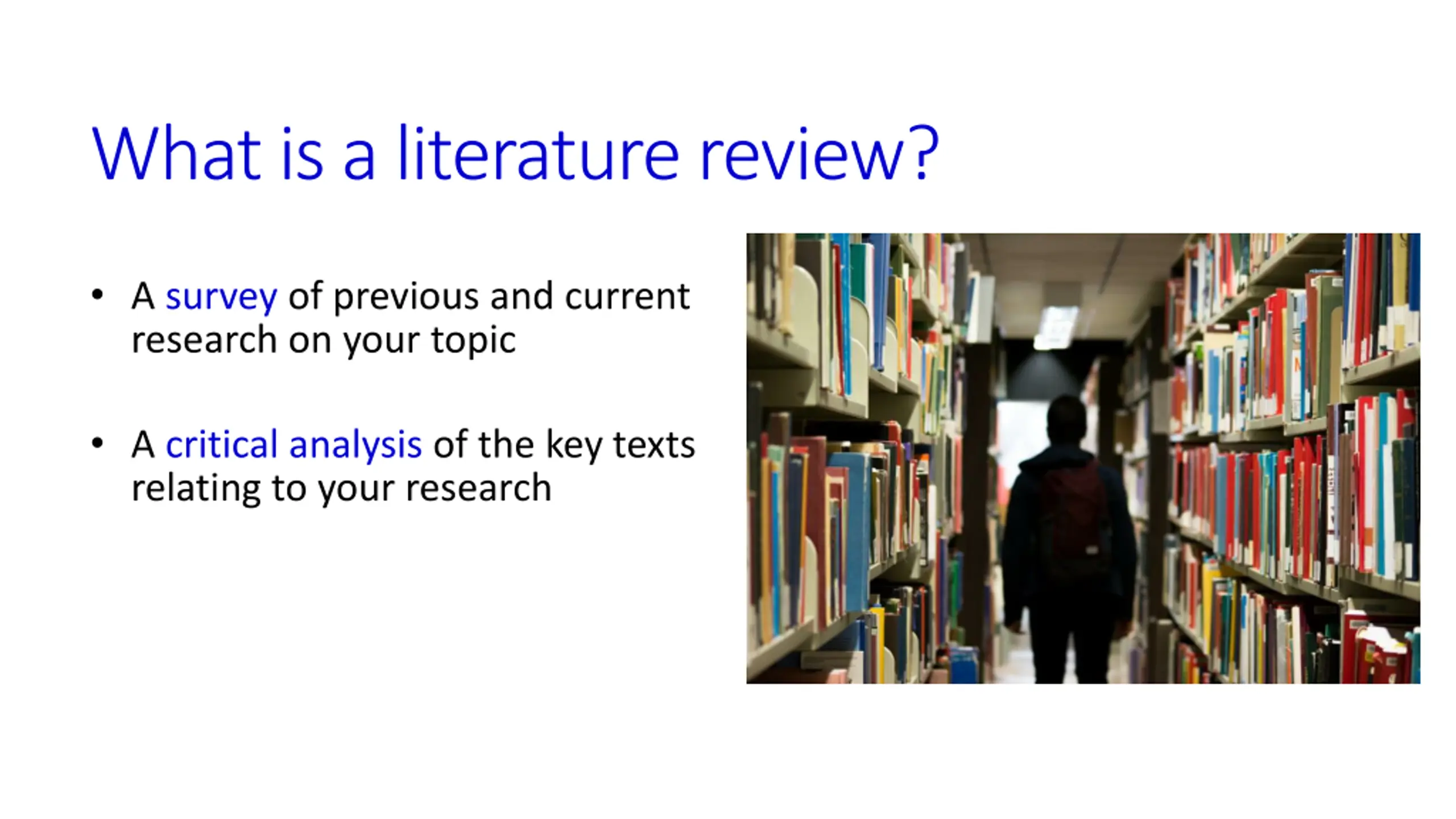 What is a literature review? A survey of previous and current research on your topic A critical analysis of the key texts relating to your research