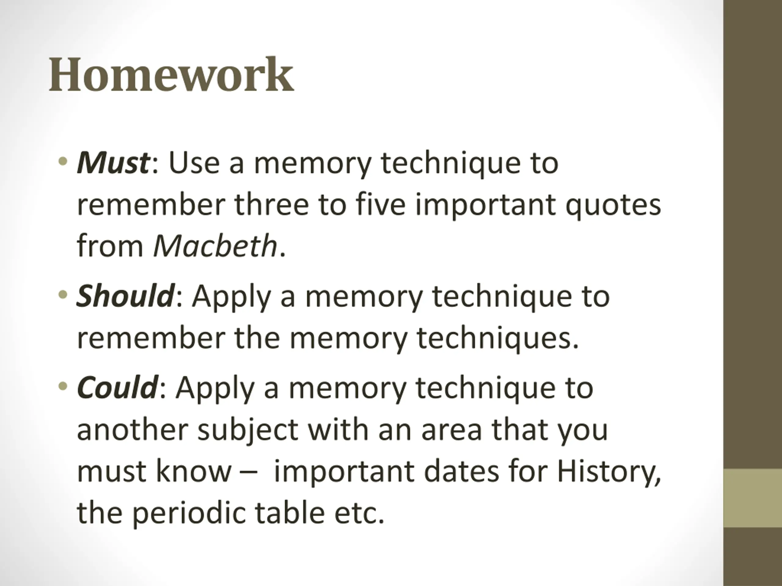 Homework Must: Use a memory technique to remember three to five important quotes from Macbeth. Should: Apply a memory technique to remember the memory techniques. Could: Apply a memory technique to another subject with an area that you must know important dates for History, the periodic table etc.