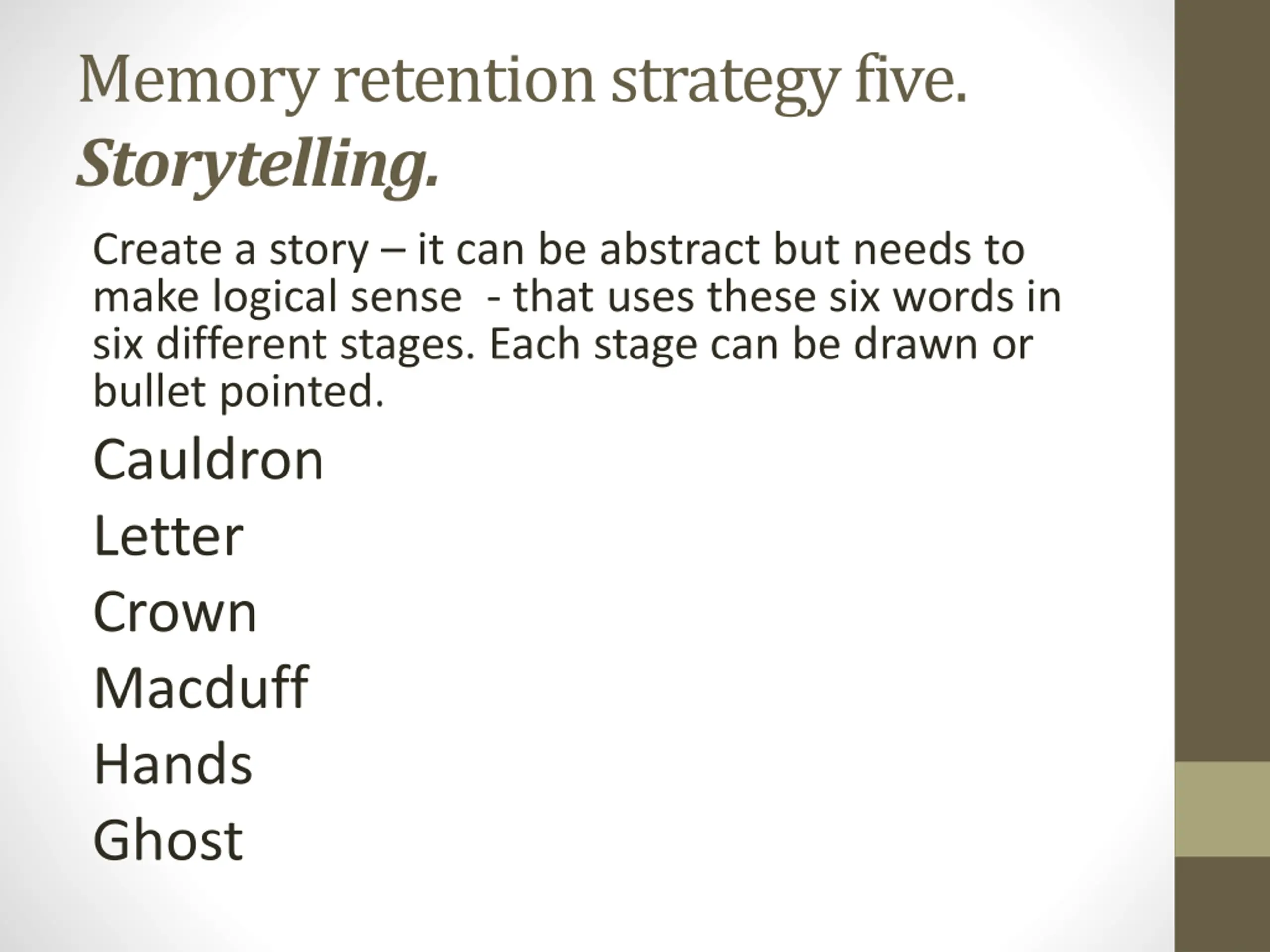 Memory retention strategy five. Storytelling. Create a story it can be abstract but needs to make logical sense - that uses these six words in six different stages. Each stage can be drawn or bullet pointed. Cauldron Letter Crown Macduff Hands Ghost
