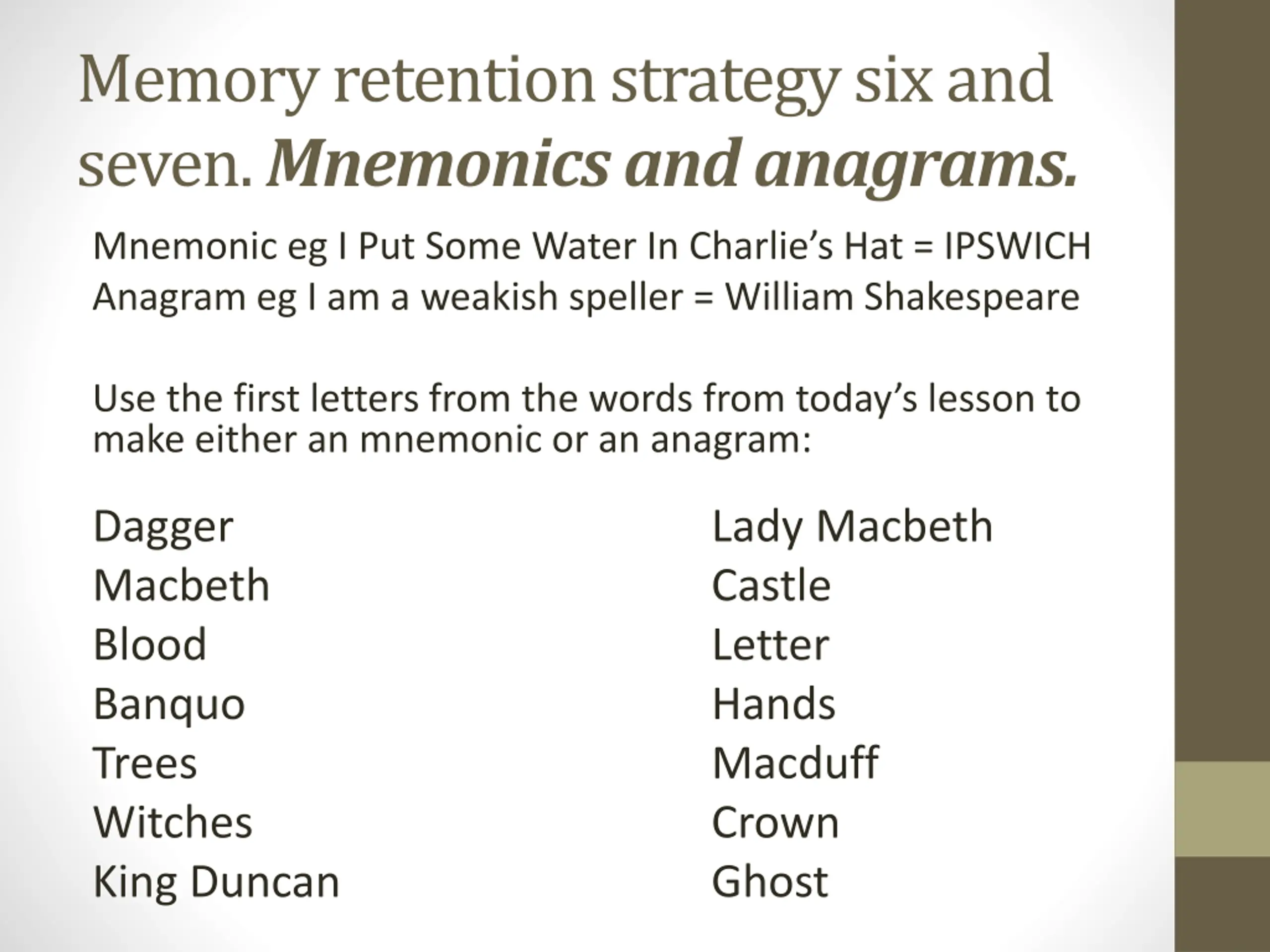 Memory retention strategy six and seven. Mnemonics and anagrams. Mnemonic eg I Put Some Water In Charlie s Hat = IPSWICH Anagram eg I am a weakish speller = William Shakespeare Use the first letters from the words from today s lesson to make either an mnemonic or an anagram: Dagger Macbeth Blood Banquo Trees Witches King Duncan Lady Macbeth Castle Letter Hands Macduff Crown Ghost