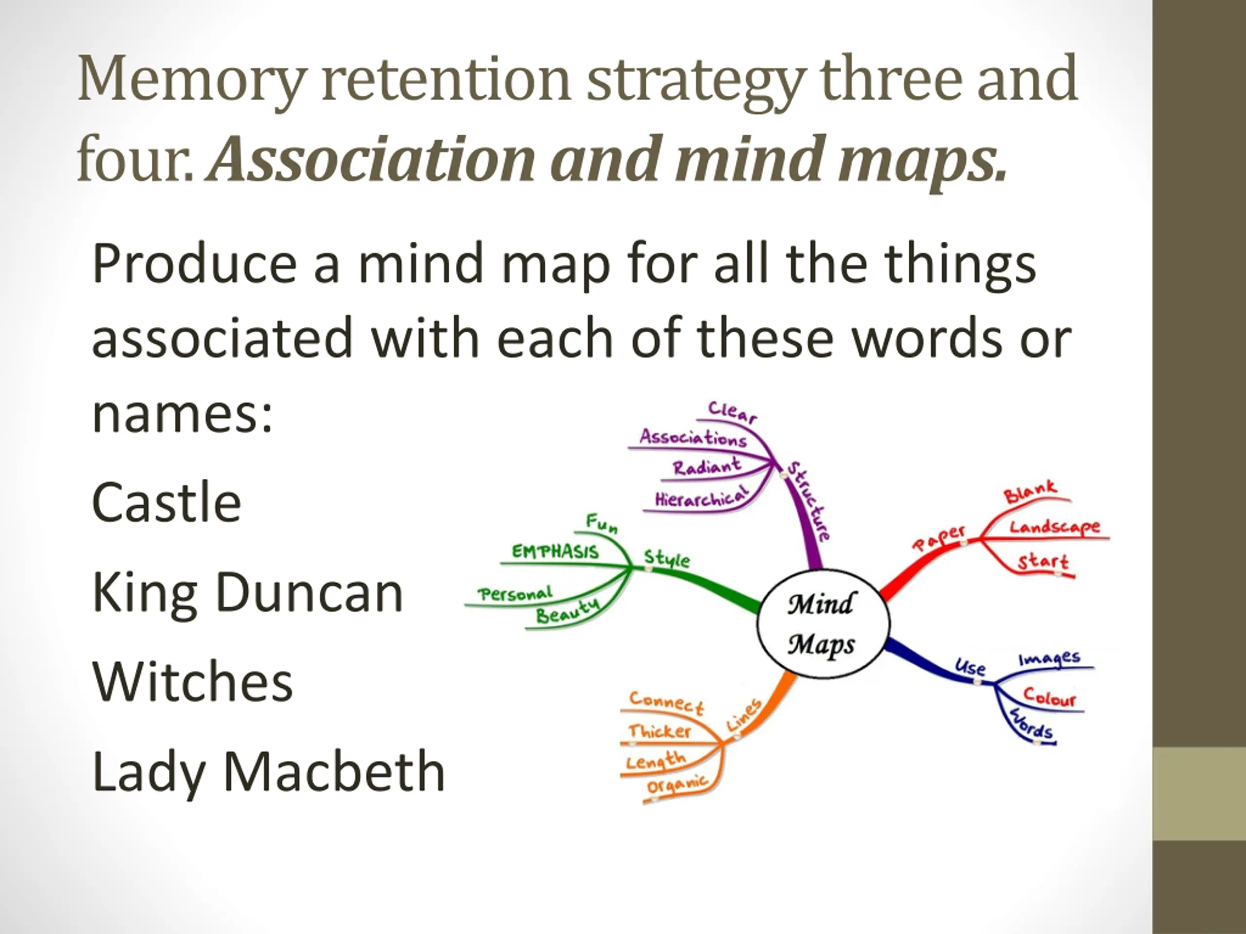 Memory retention strategy three and four. Association and mind maps. Produce a mind map for all the things associated with each of these words or names: Castle King Duncan Witches Lady Macbeth http://infiniteminds.info/images/How_to_use_Mind_Maps.jpg